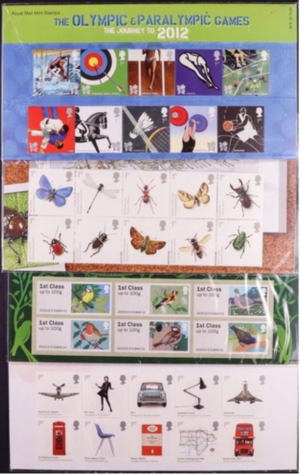 Face value £540 GB QEII fine mint NH stamps in Presentation packs, 1990’s to 2012 comprising Royal Mail useable stamps for discount postage with some 1st class stamp sets. Post and Go etc.