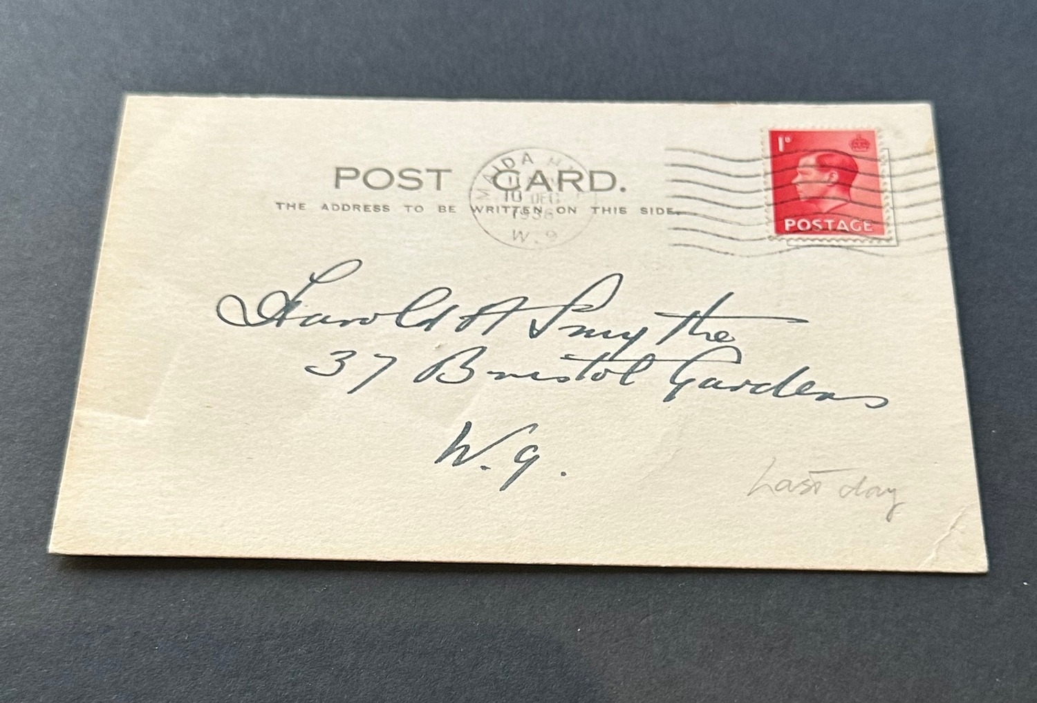 GB KEVIII Abdication day cancelled 1d red stamp on postcard London W.9 MAIDA