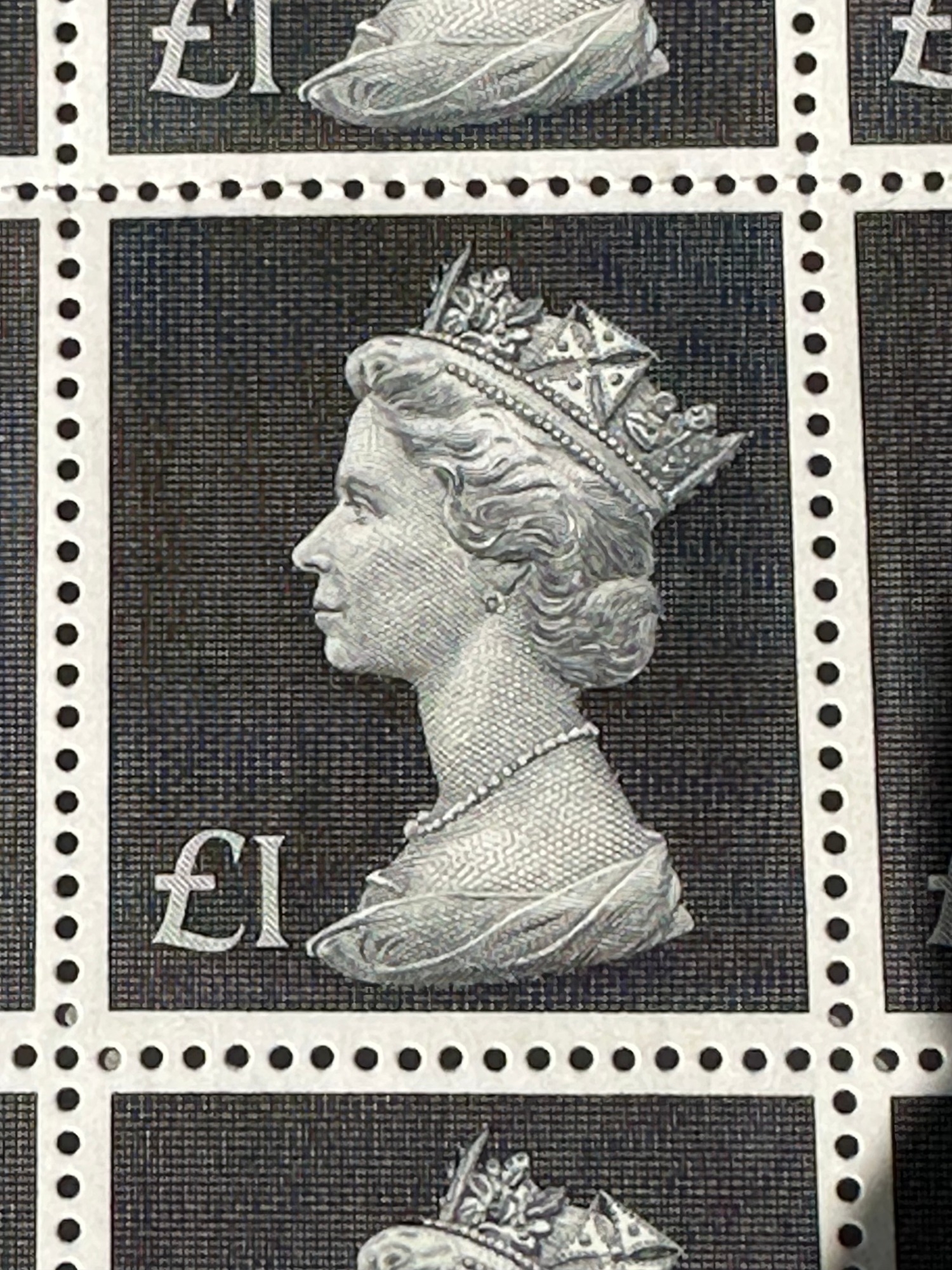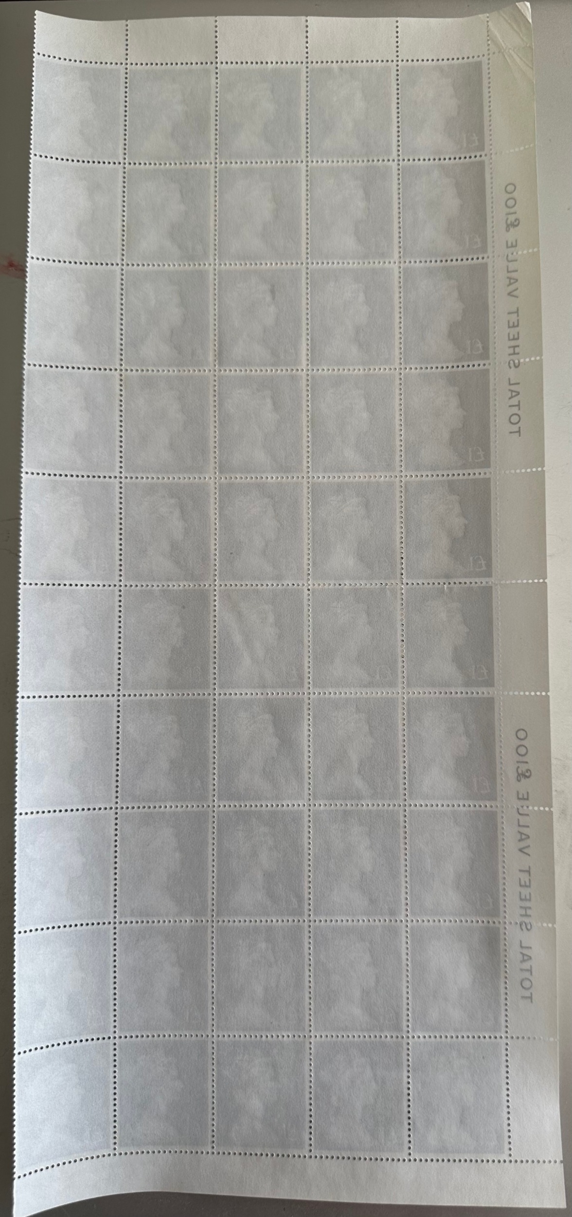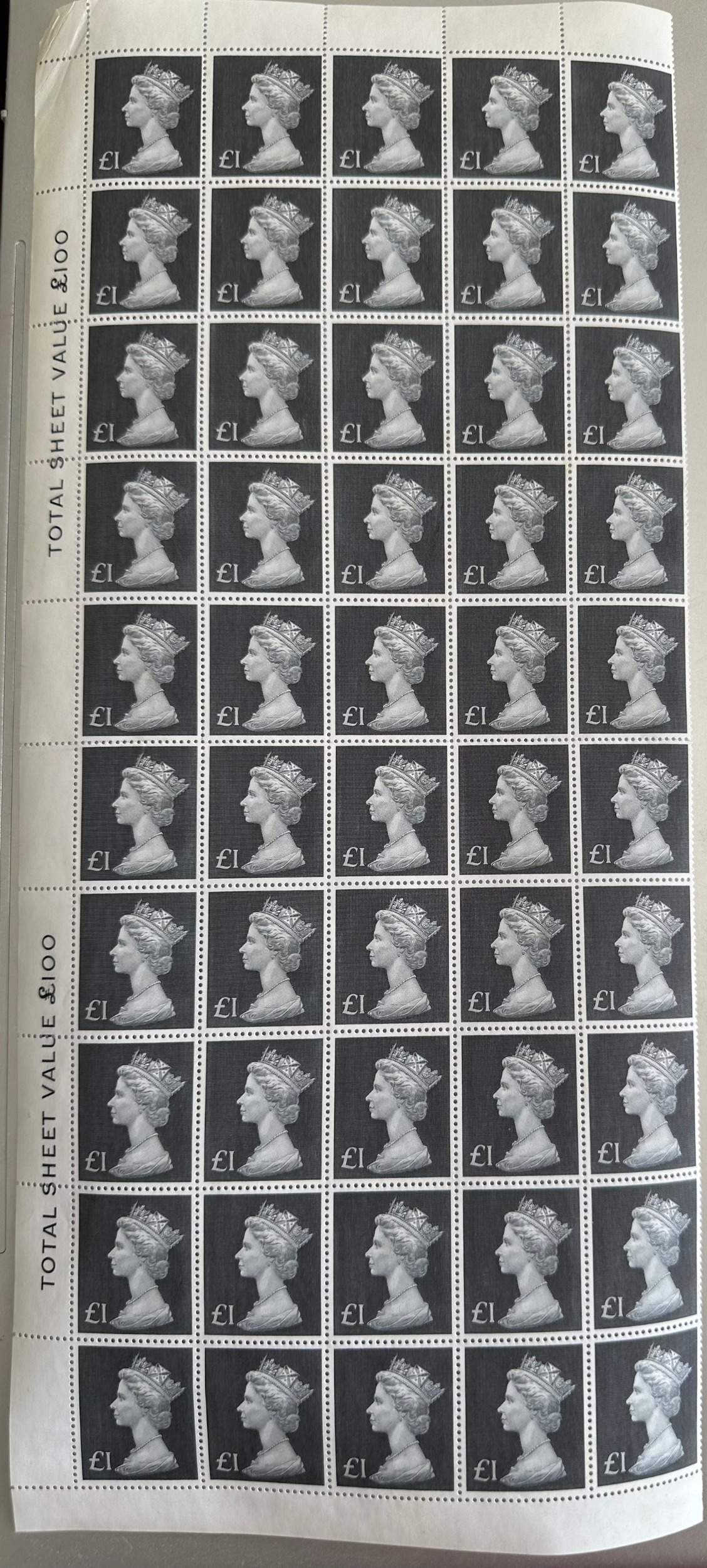 Rare block of 50 mint stamps x �1 half sheet SG790 GB QE II Large format, large value cylinder / margin block grey / black, some creasing on top L corner / margin, rectangular dots, a/f, stored and posted folded in half horizontally