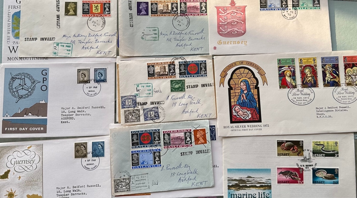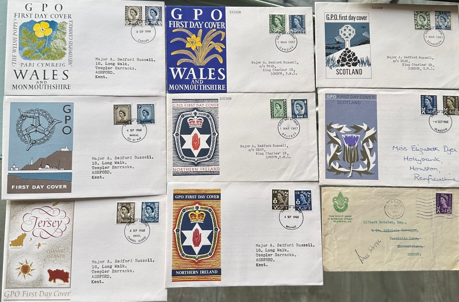 GB Regionals FDC’s inc Wales, Scotland, Northern Ireland and Channel Islands Wildings stamps.Stamp Invalid and Postage Due stamps. Forces Air Mail. Military interest Major Anthony Bedford Russell Dec’d