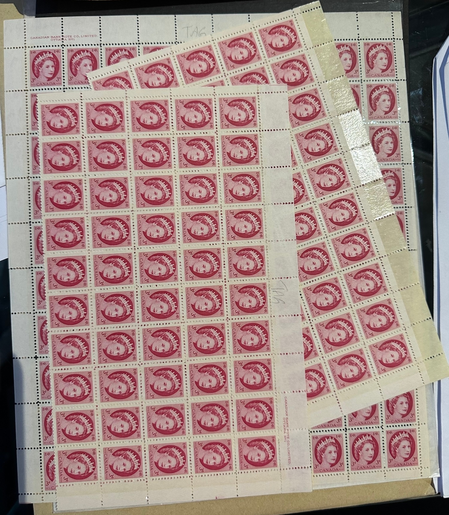 CANADA 1954 -1962 defin 3c, QE2, with two phosphor bands – three u.m. sheets of 100, SG465, 300 @ £1.50 each = £450
