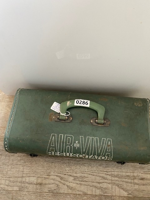 Rare vintage CIG AIR VIVA RESUSCITATOR, medical equipment, made in Alexandria, New South Wales, Australia c 1960 consisting of a sage green fibre board box with carry handle. Opens out and contains a resuscitation kit. Issued to Ambulance stations and public venues as it was easily used by personnel with limited professional training.