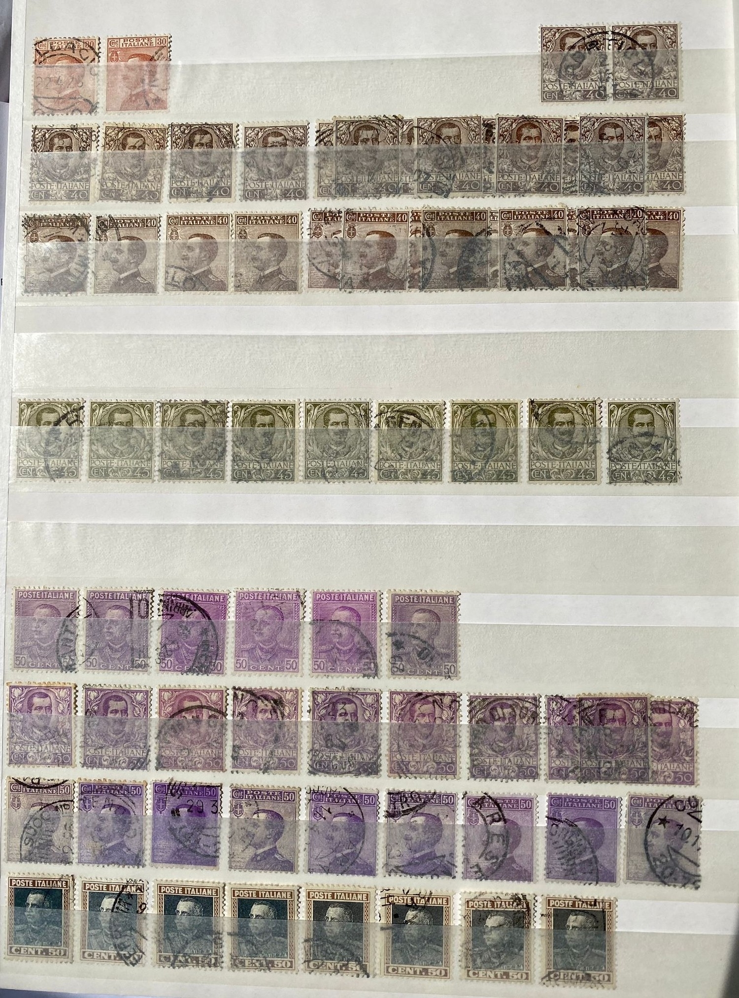ITALY duplicated lot of early stamps on stockleaves of 1863-65 issue (c.48, inc 2 lire), 1889 values inc. 1lire stamp (4), 1891-97 5lire, 1901-08 defins (c.353, inc.7 of 1910 10 lire0, 1927-29 2l55 (2) and 2l65, 1903-26 Express issues (49), and many others