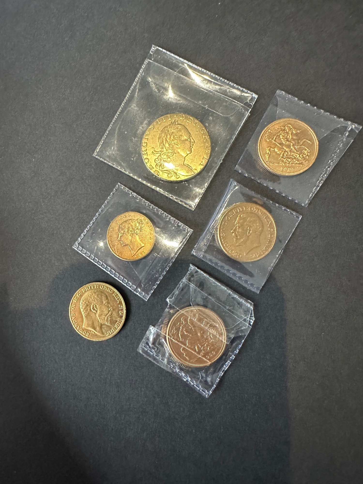 Small collection of 6 gold plated coins (inc sovereigns) from George III to QEII