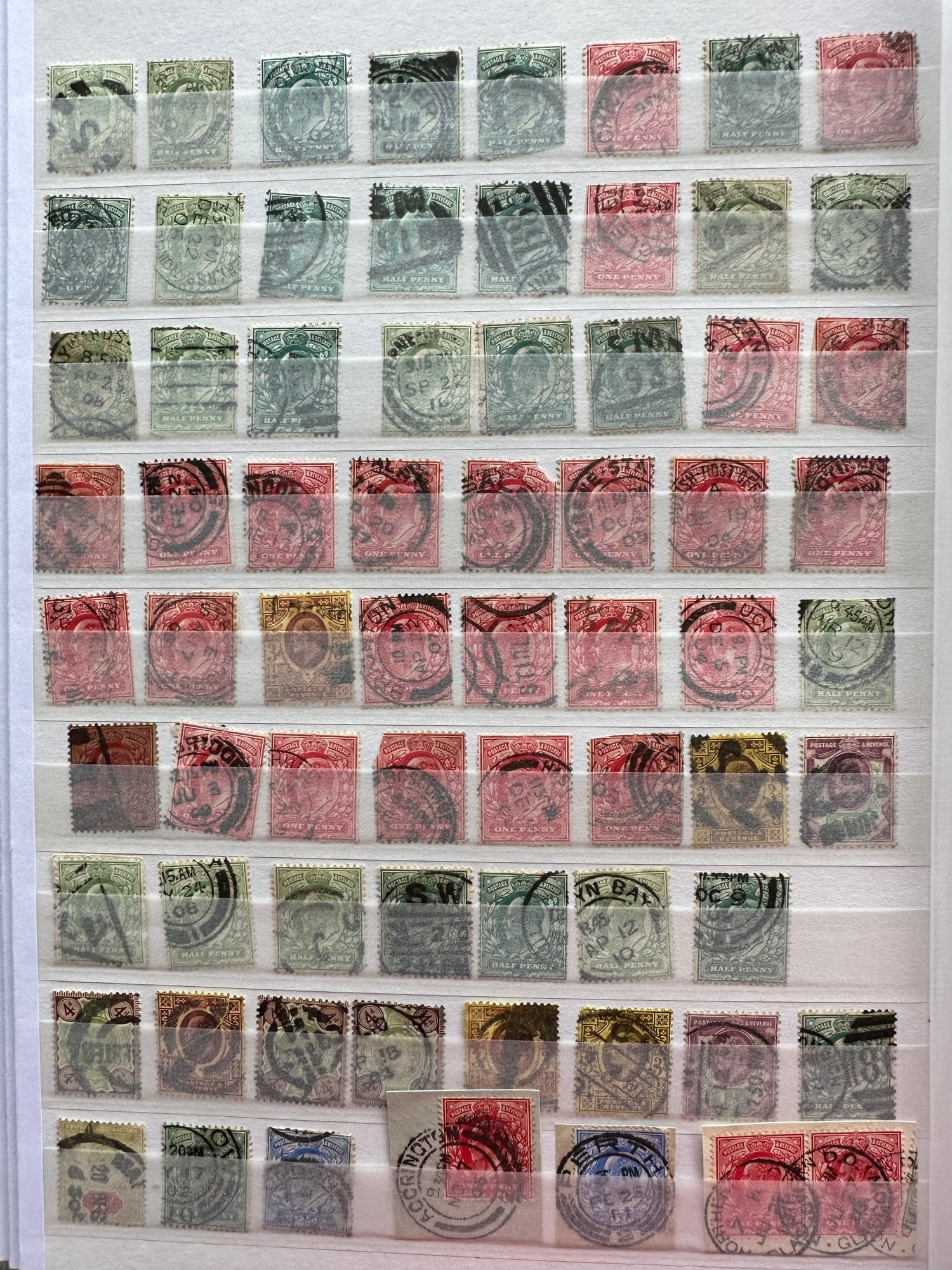 GB, Canada, Gambia (inc. pairs), Edward VII used stamps in dealers stock book, perfins noted, some good clear cancels, approx. 2,000 total stamps