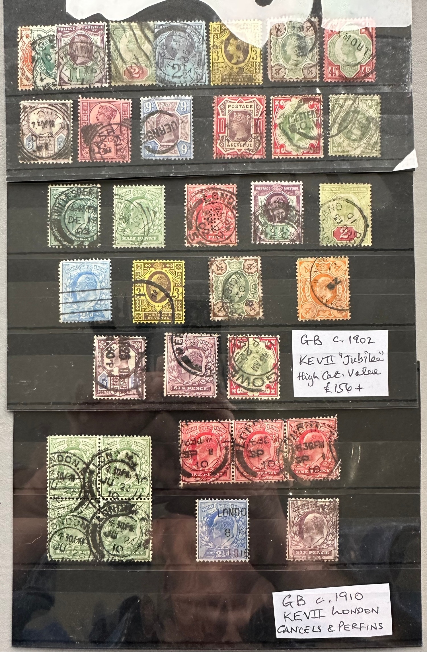 GB Early Used Stamps selection / collection on stock cards inc. QV Jubilee edition KEVII inc block and strip to one shilling. London (perfin), Glasgow, Exmouth and Manchester, Guernsey bullet cancels noted
