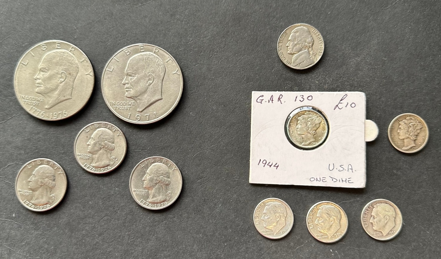 American coins including silver coins ( on the right side ) various dates from 1920 (Liberty Dime)