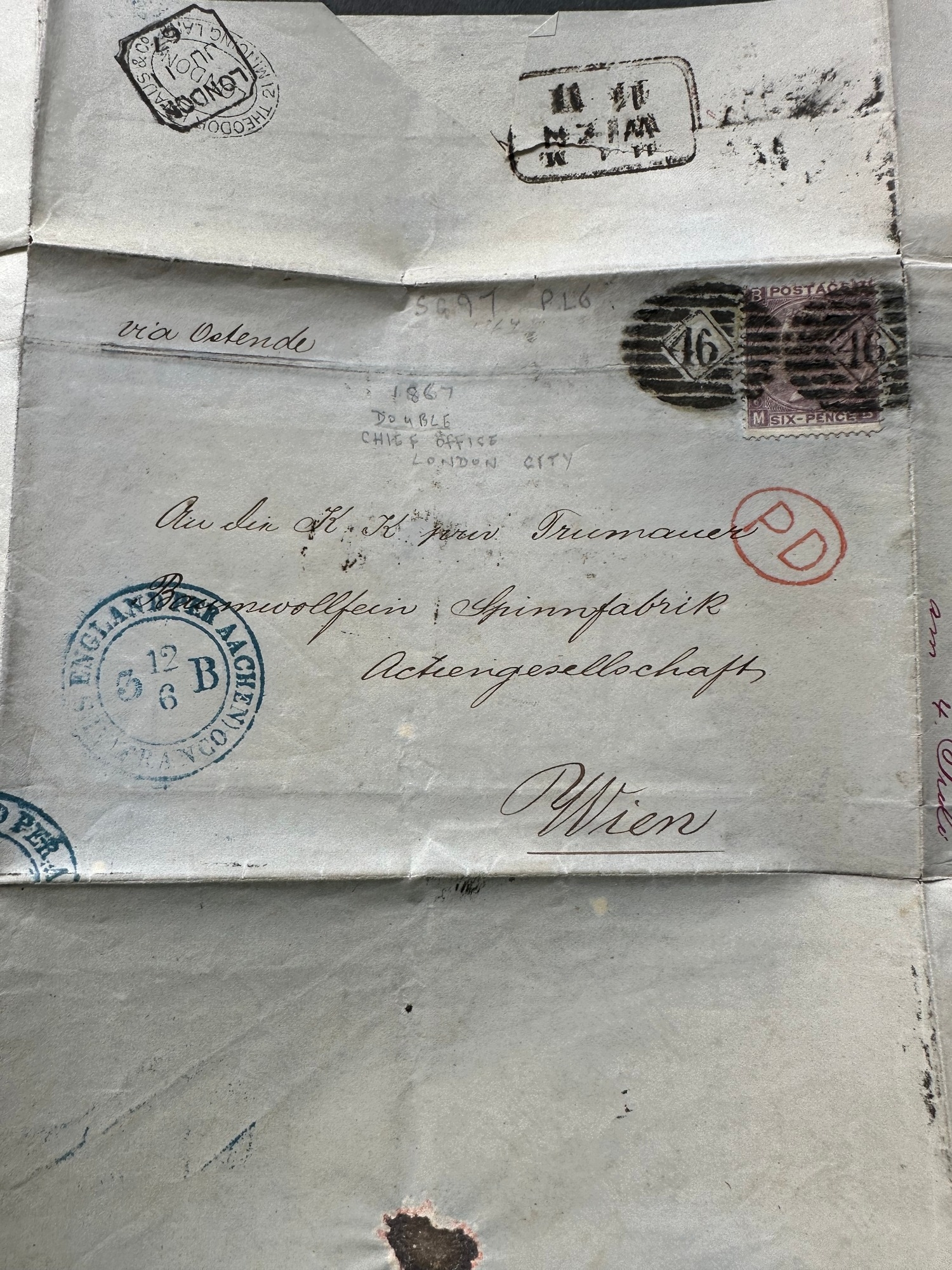 GB QV 1867 six pence (M-B) Plate 6 cover London to Wien via Ostende. Double strike Chief Office London City. Stamp has high cat value �250