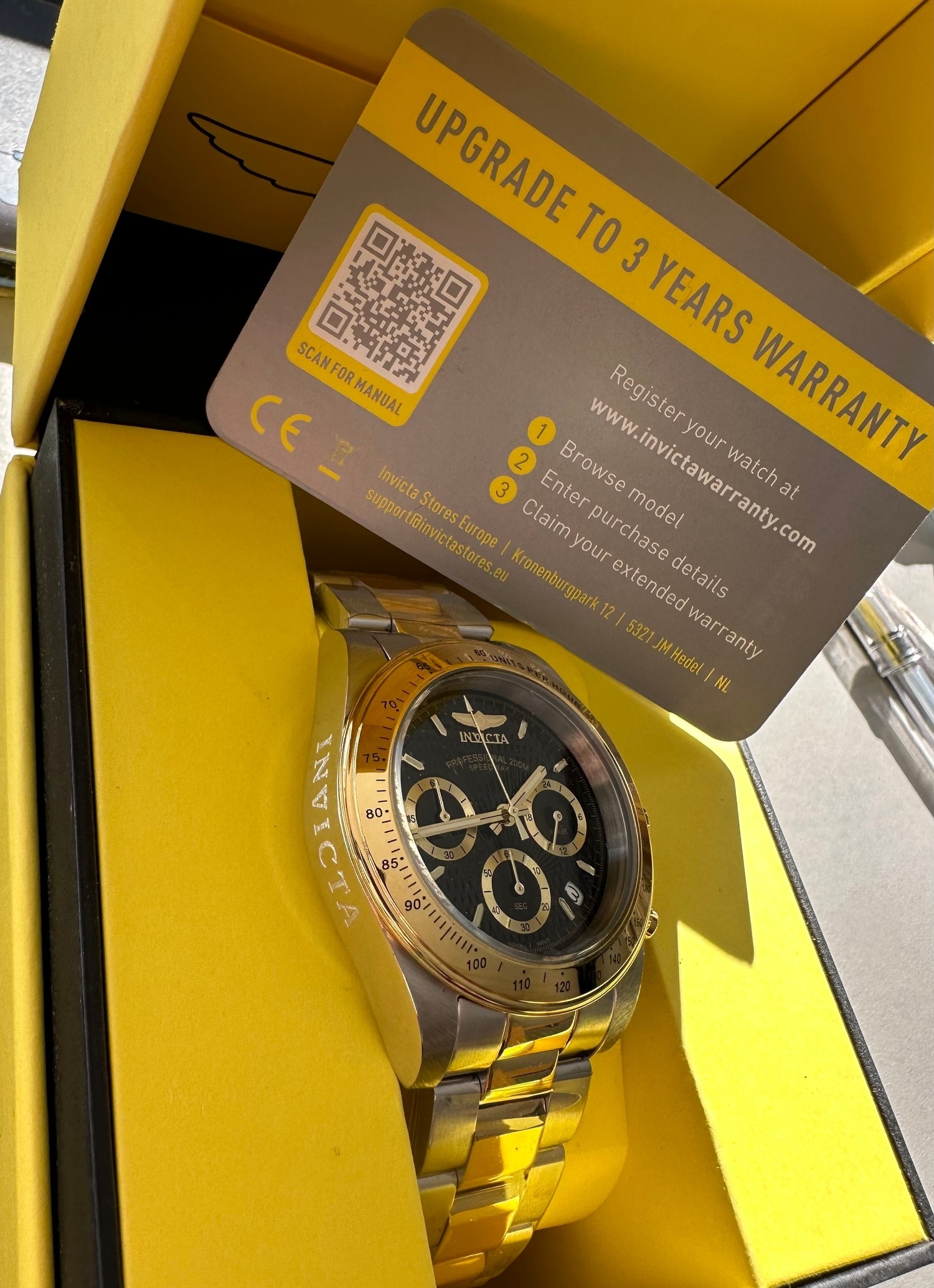 INVICTA Speedway chrono mens watch, 200m, stainless steel gold and silver strap, black and gold face, boxed