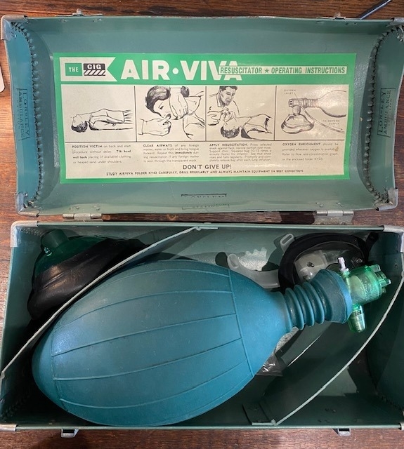 Rare vintage CIG AIR VIVA RESUSCITATOR, medical equipment, made in Alexandria, New South Wales, Australia c 1960 consisting of a sage green fibre board box with carry handle. Opens out and contains a resuscitation kit. Issued to Ambulance stations and public venues as it was easily used by personnel with limited professional training.