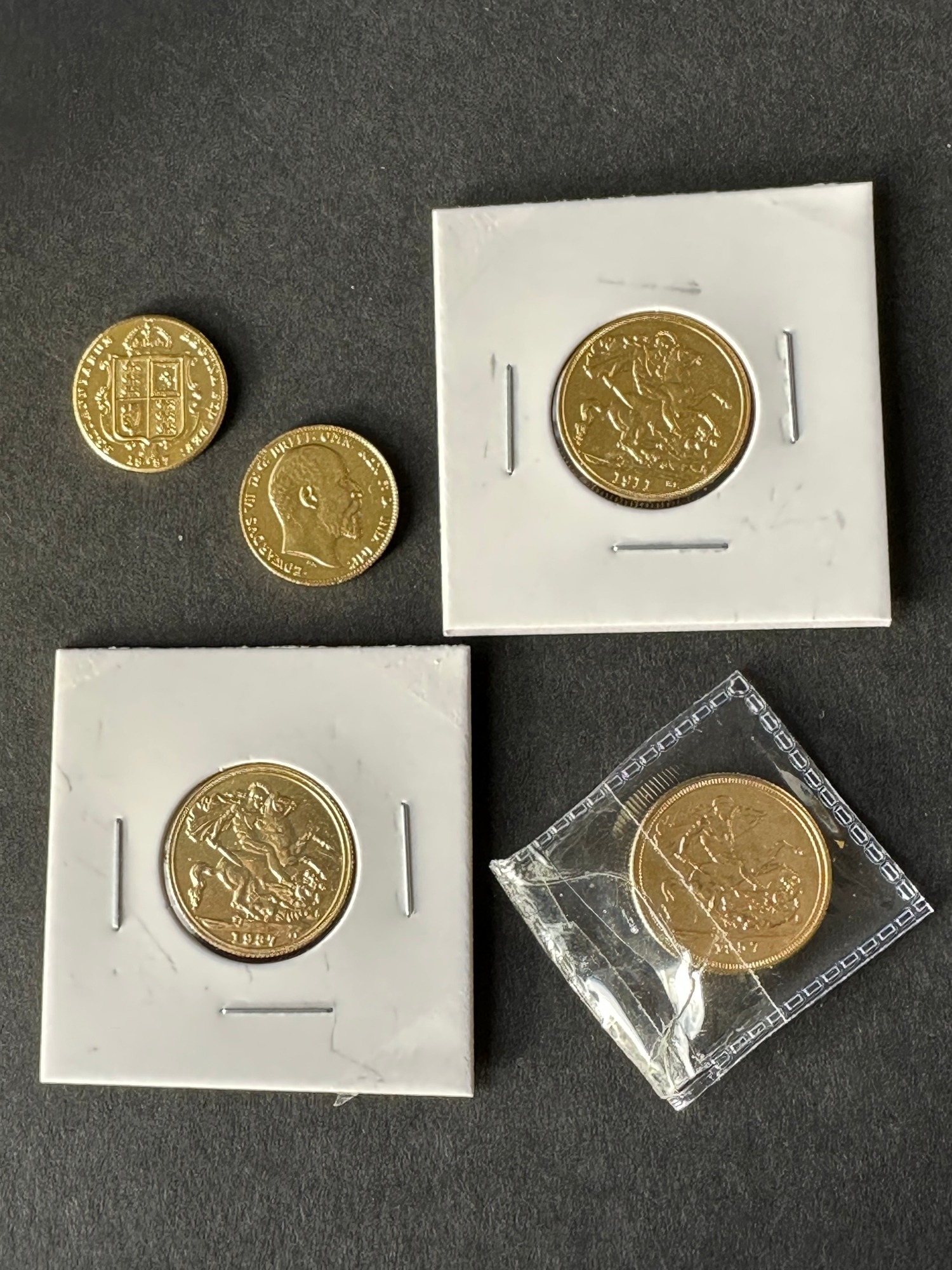 Gold plated coins featuring 5 different monarchs from QV to QEII