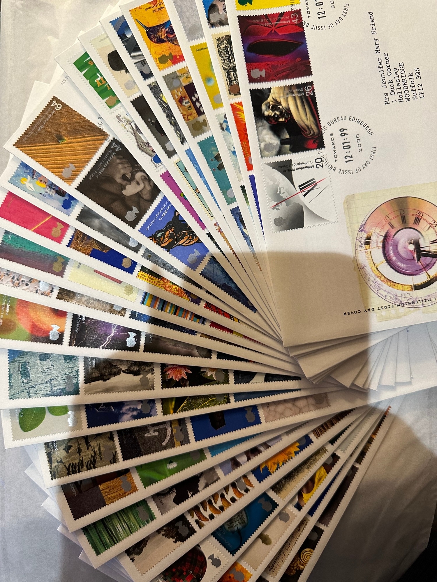 Millennium stamps FDC x 24 months 1999 and 2000 all with BPB Edinburgh cancels and all typed and addressed to the same person in Woodbridge, Suffolk