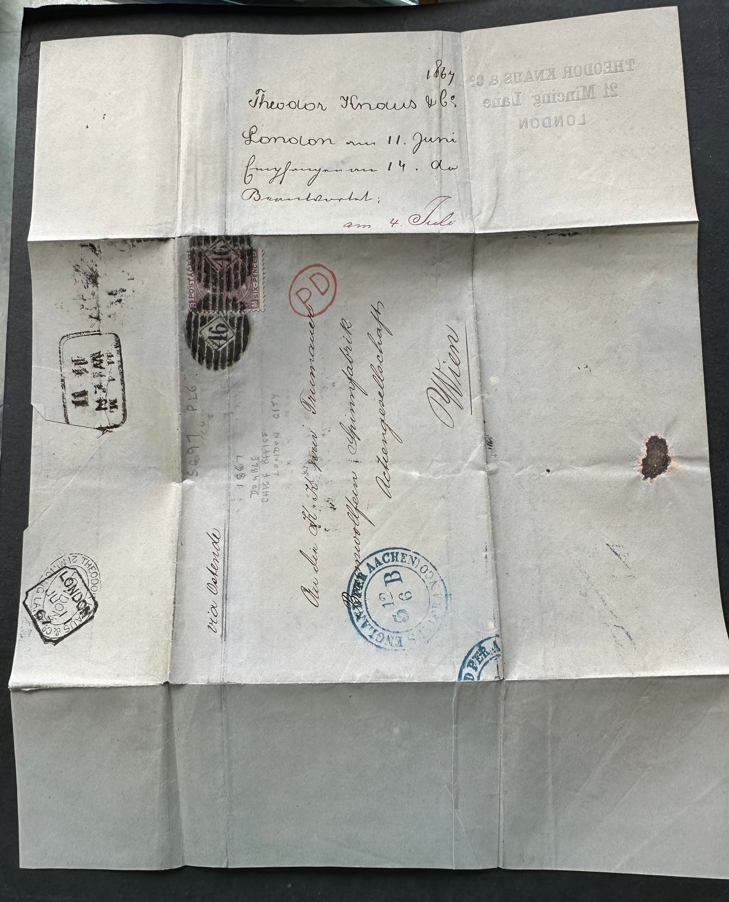 GB QV 1867 six pence (M-B) Plate 6 cover London to Wien via Ostende. Double strike Chief Office London City. Stamp has high cat value �250