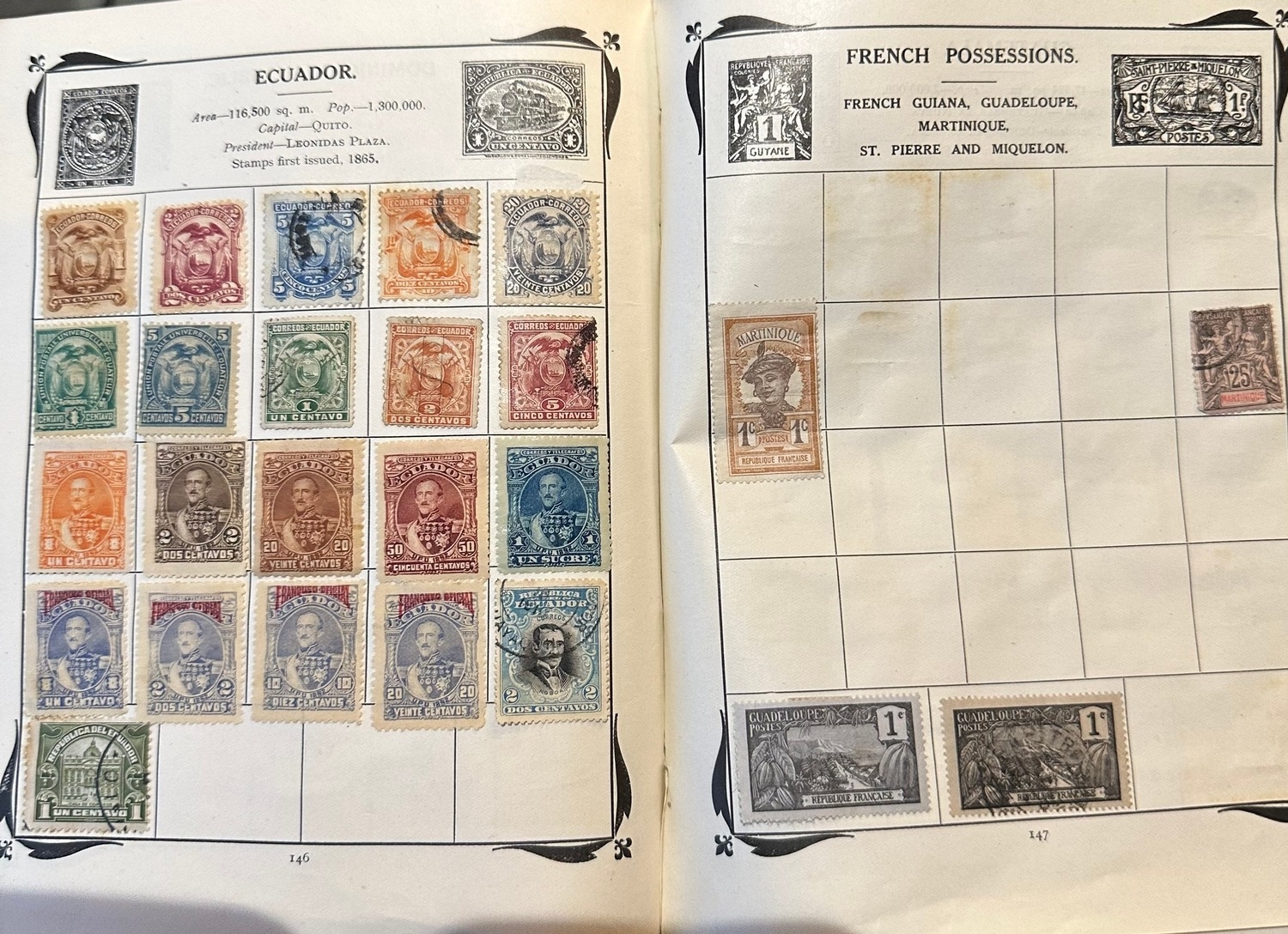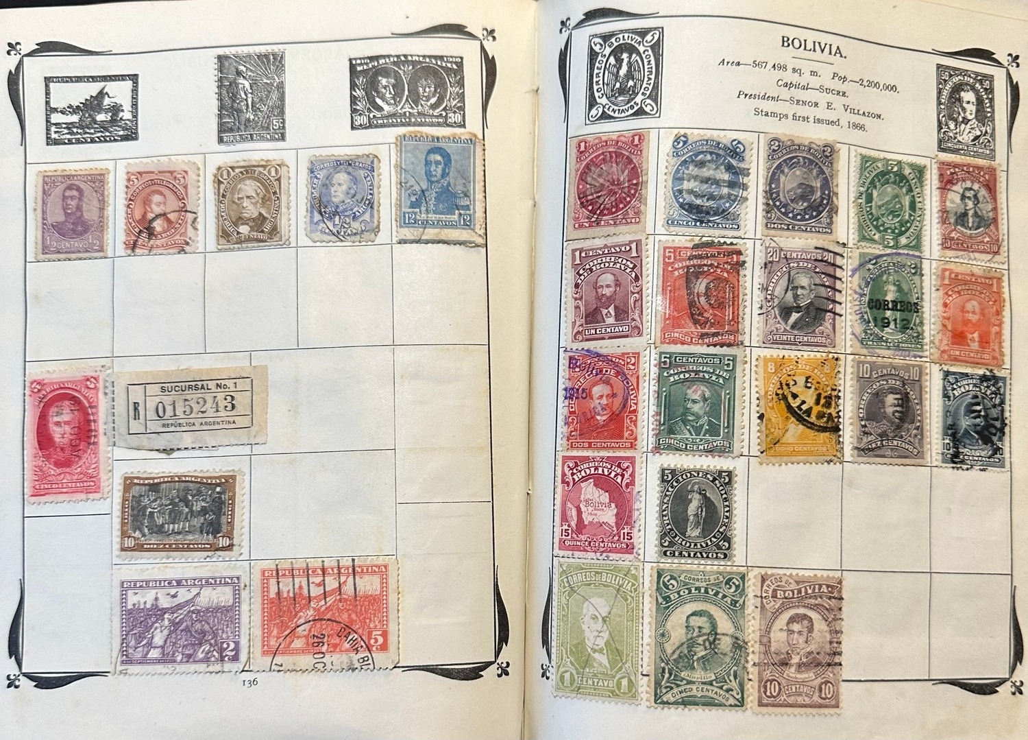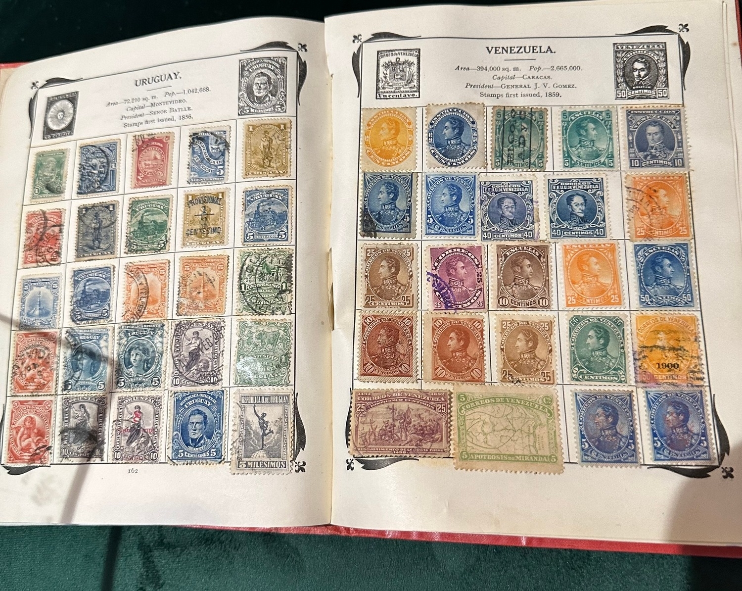 Antique Stanley Gibbons Improved stamp Album from 1916 including QV, KE, KG GB and Commonwealth stamps, Well represented are South America and European countries, some India / states, probably a few hundred stamps or maybe more mint and used collection