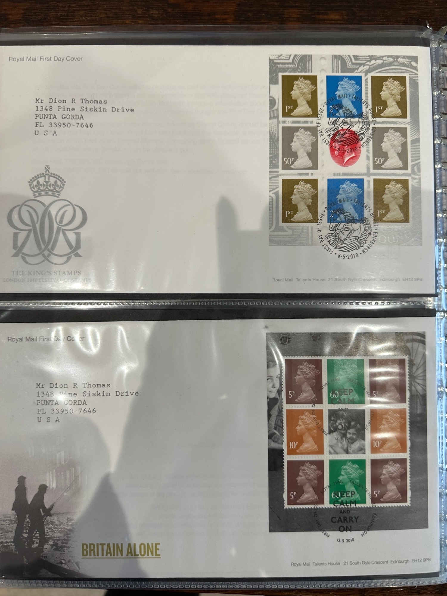 Album containing over 50 GB prestige stamp booklet panes on FDC’s ( to 2010 ) all sent to US typed addresses which is more unusual inc. James Bond, Classic Album Covers