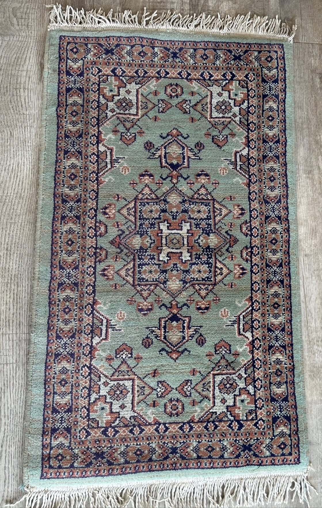 Vintage traditional ‘"Panorama" Turkish wool rug / prayer mat, approx. 20 inches wide x 3ft length