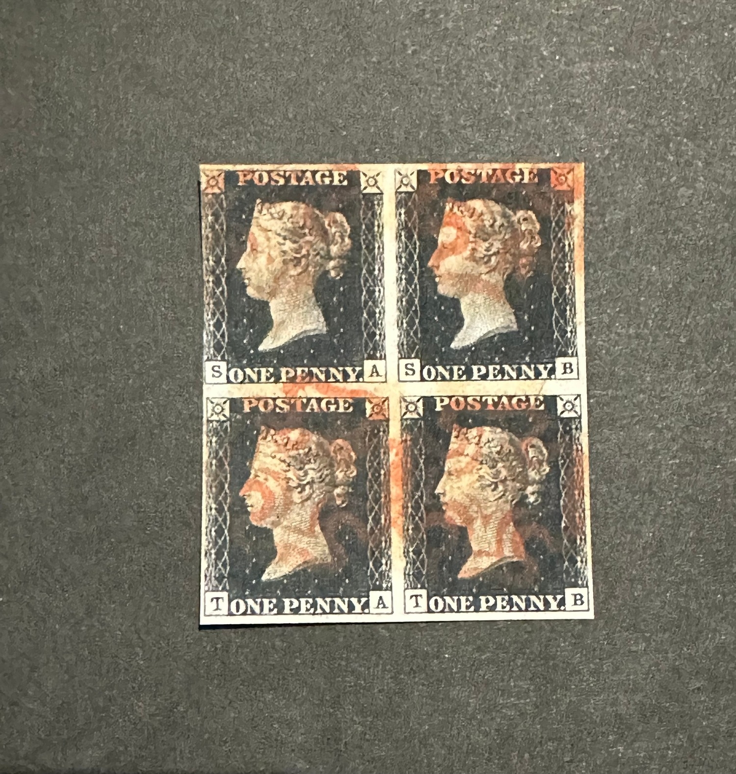 GB QV block of 4 penny black stamps with red Maltese crosses, SG1, FORGERY / COPIES / REPLICA a/f