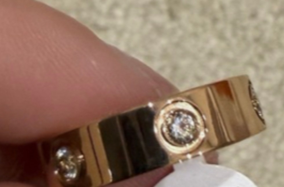love ring, rose gold colour, replica. Sold as not containing any precious metal. 6P Faux Diamonds, Size L1/2. A/F