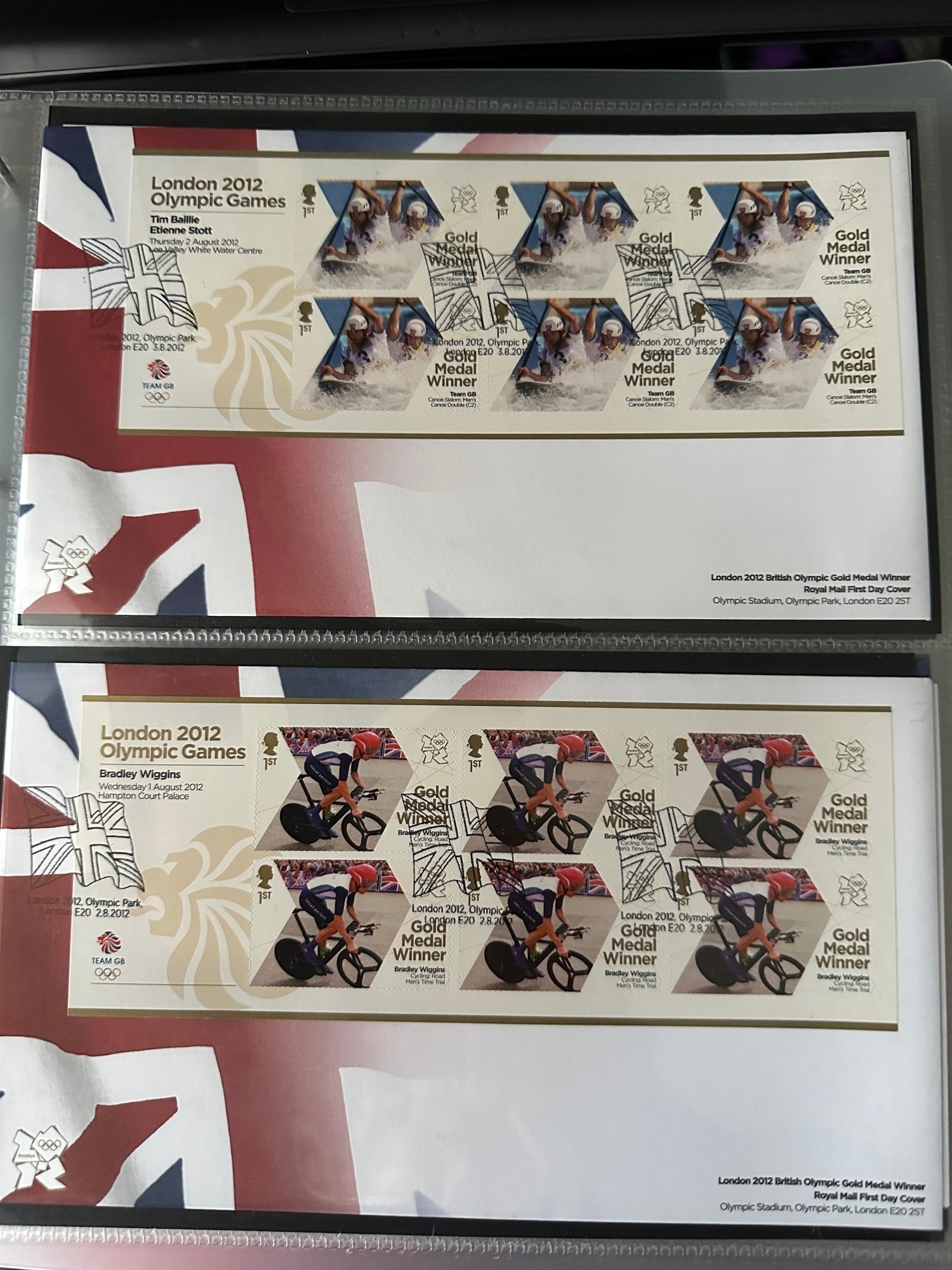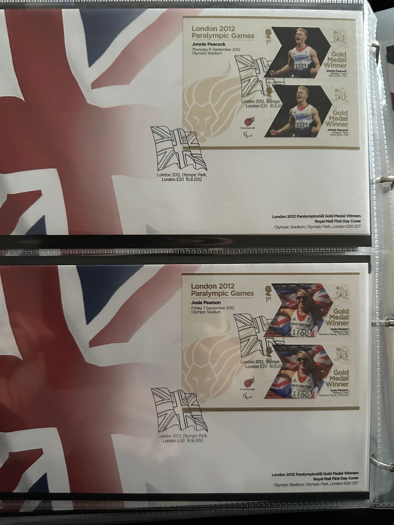 London 2012 Olympic and Paralympic Team GB Gold medal winners FDC stamps Complete collection ( 34 & 29 FDC’s ) in Royal Mail Album