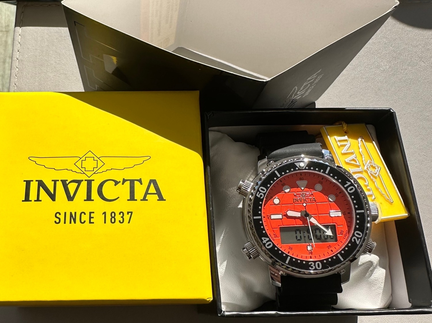 INVICTA gents Pro Diver wrist watch with box and tag, 50m water resistant, Japan movement. Black silicon strap and orange face