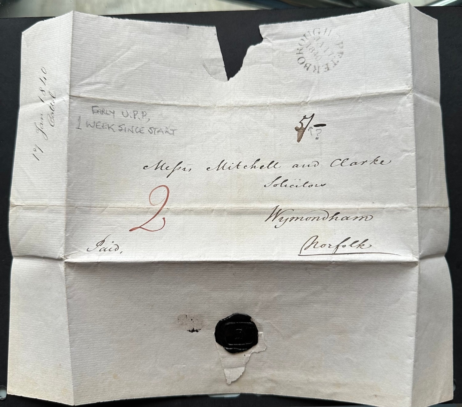 Jan 1840 early UPP pre-stamp cover with seal, Peterborough to Norfolk