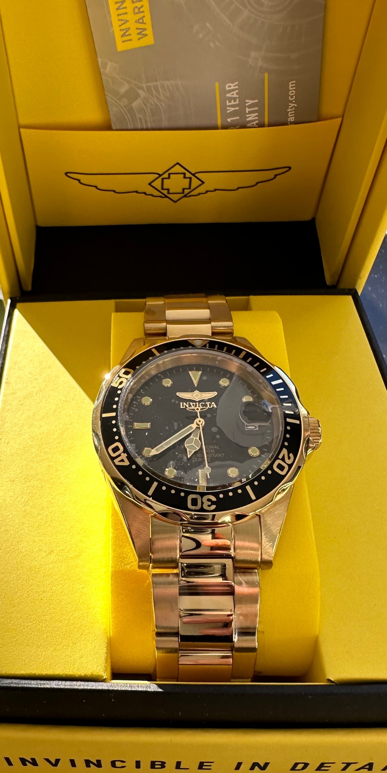 INVICTA mens Professional Diver watch 200m, gold tone stainless steel strap, black face, retail c. $500+ boxed
