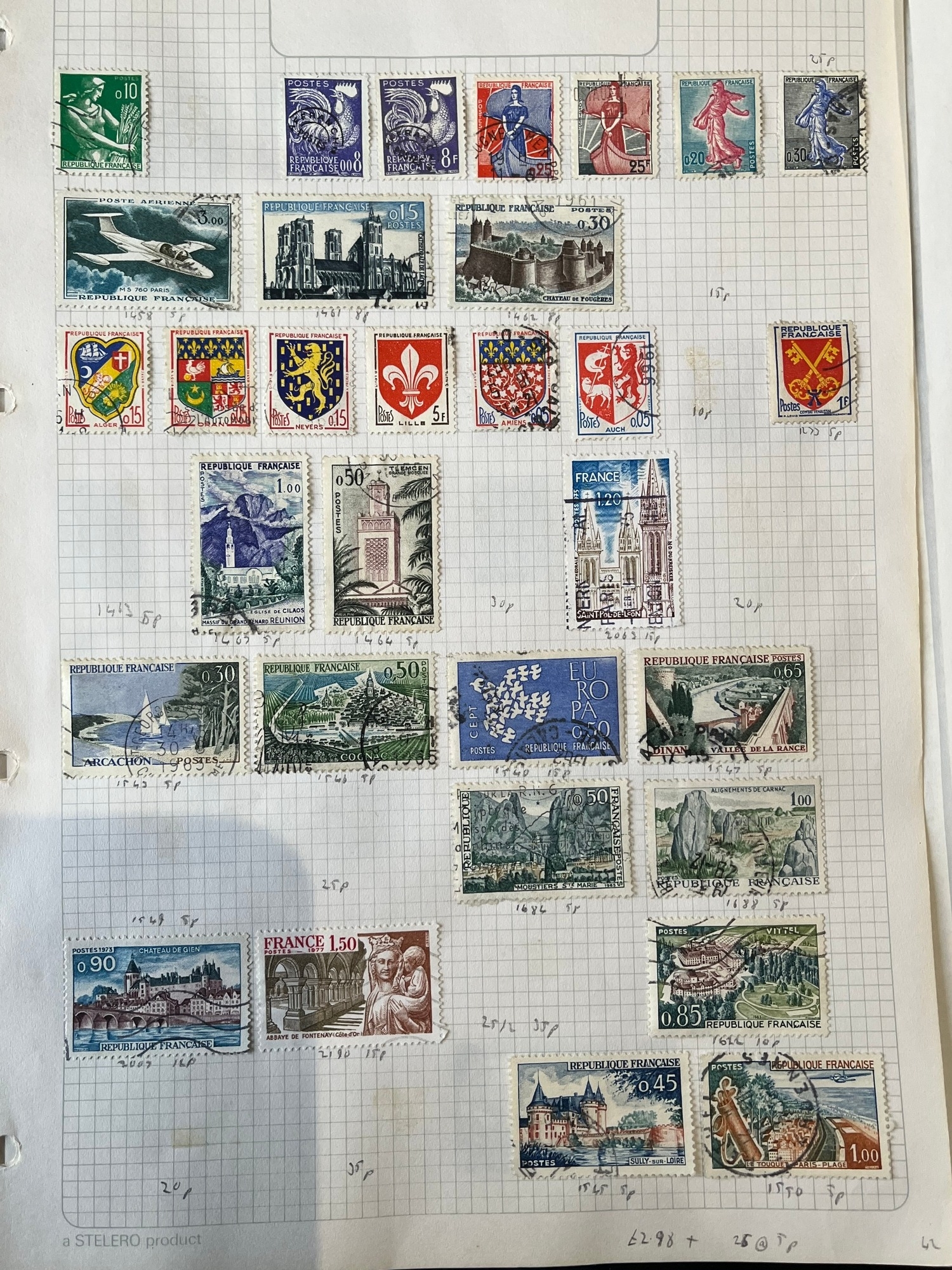 France / Republique Francaise stamps – early to mid century on old stamp album pages