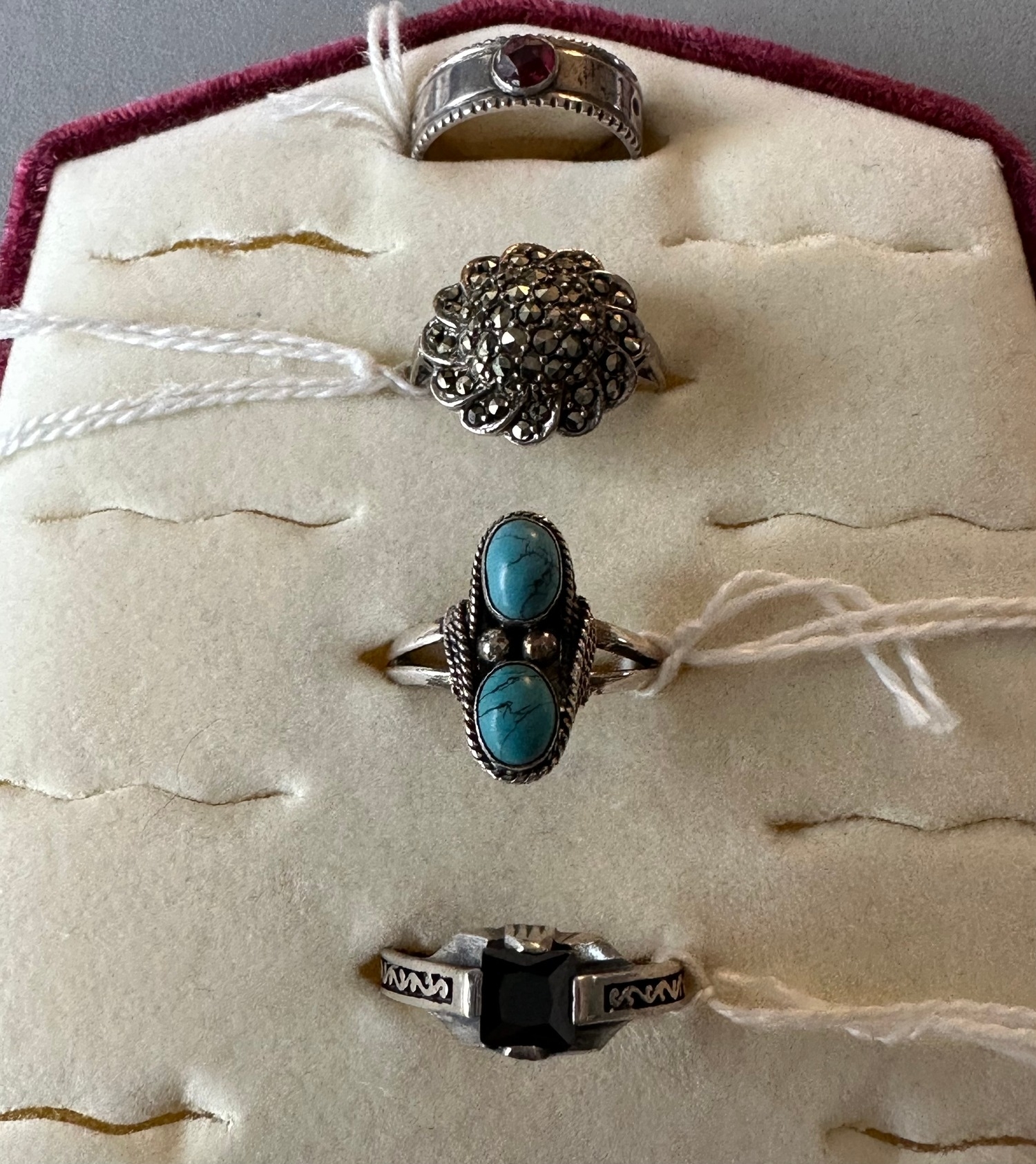 solid silver rings selection, sizes N, R S and U (top to bottom) handmade garnet, 1930’s marcasite, turquoise carbochon and Moroccan faceted haematite signet ring. Dealer overstock, jewellery pad not included sorry