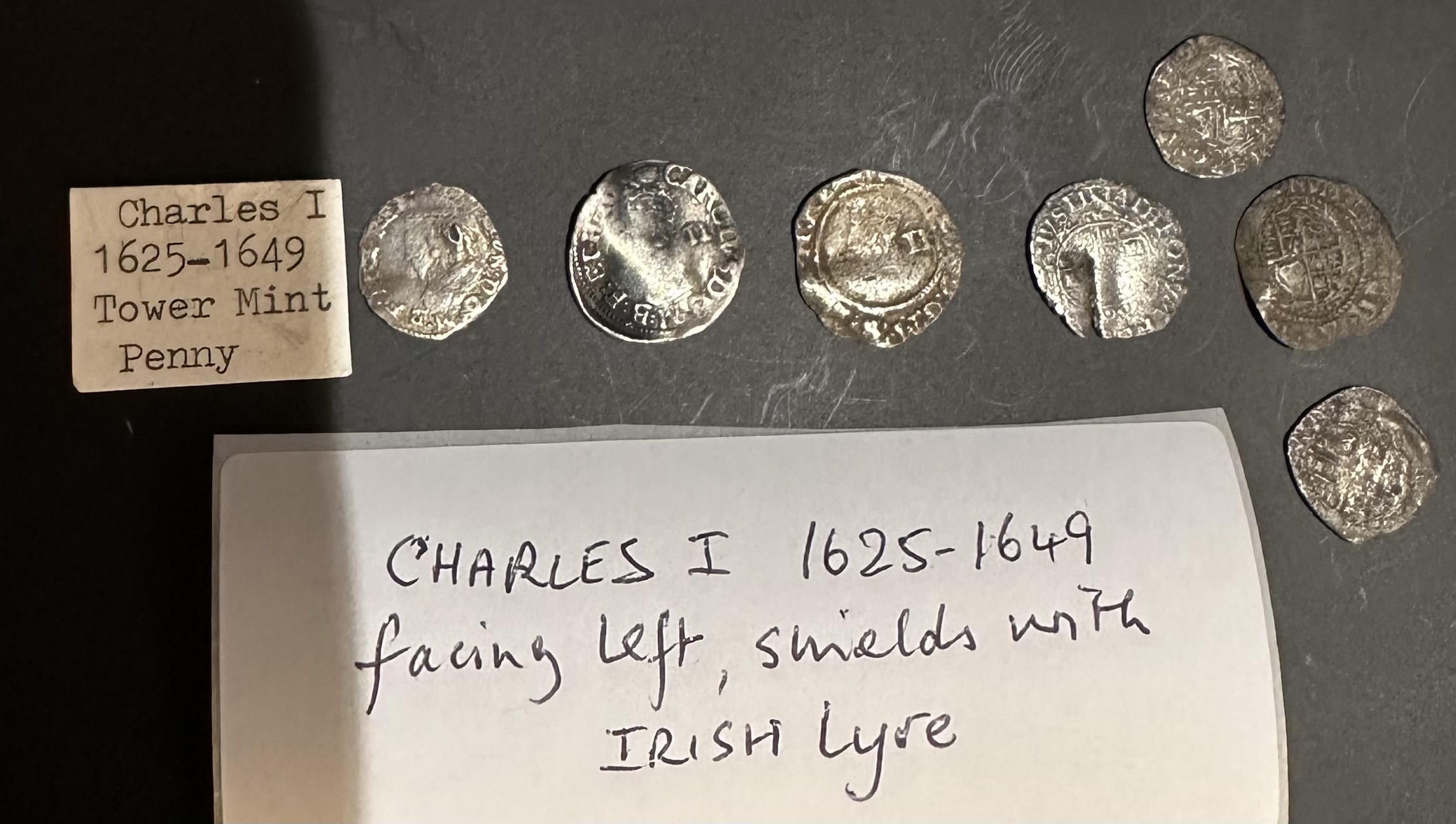 Irish lyre on shield, left facing bust of KCI, 7 coins