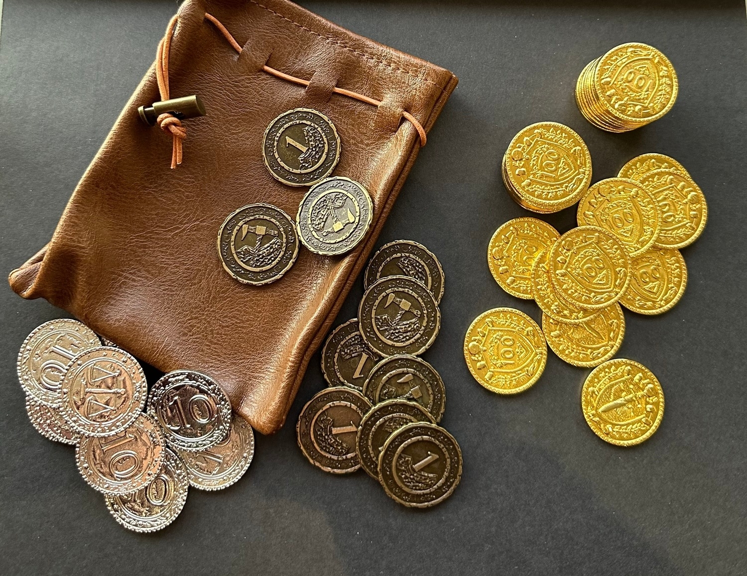 50 metal tokens / coins for entertainment / fantasy / treasure hunt, play gambling i.e. with cards etc. with pouch, gold, silver and bronze tone