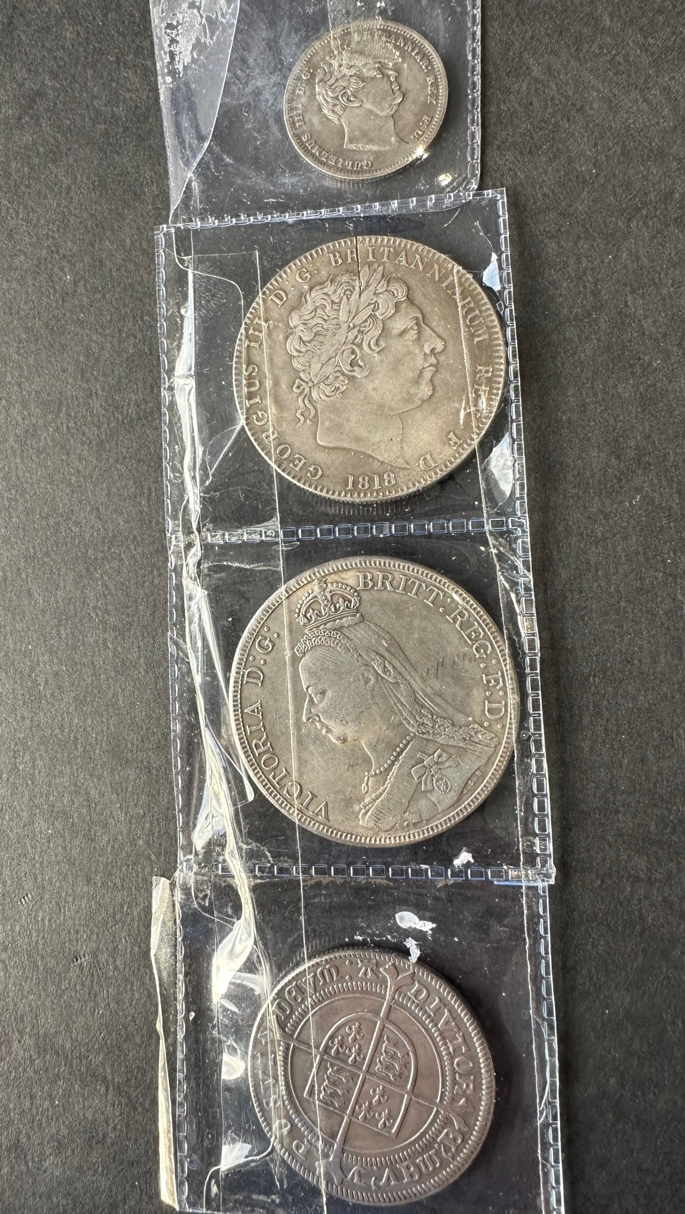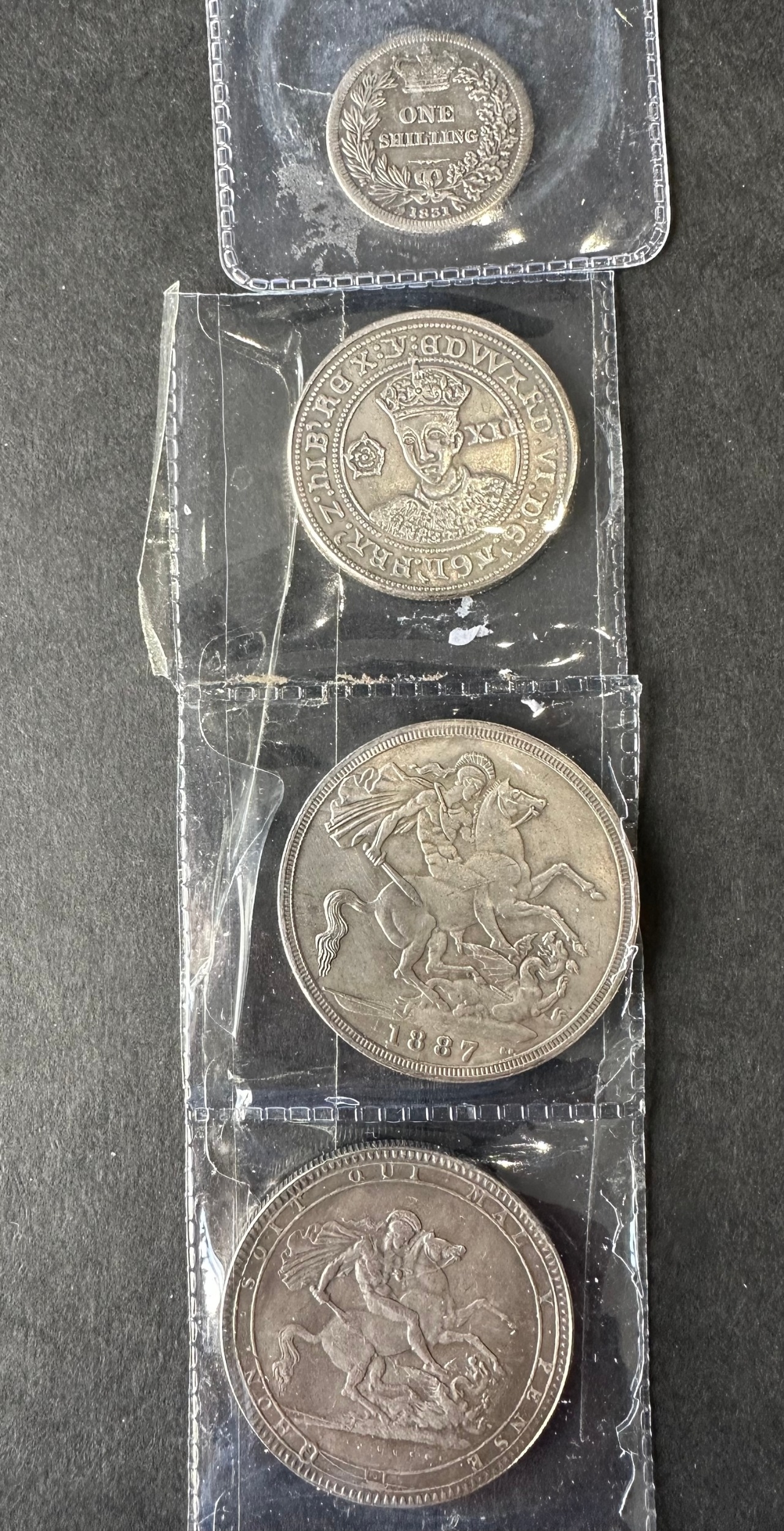 4 silver plated replica coins from 1551 original size shilling with Tun mintmark to 1887 QV crown