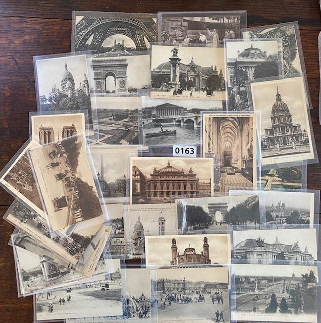PARIS FRANCE 32 Edwardian and early 20th century post cards one being a beautiful colour one of The Eiffel Tower and two double length folded postcards, Paris city view, Notre Dame, La Place de la Concorde, horses and carriages around L’Arc de Triomphe, Avenue de l’Opera , vintage vehicles etc