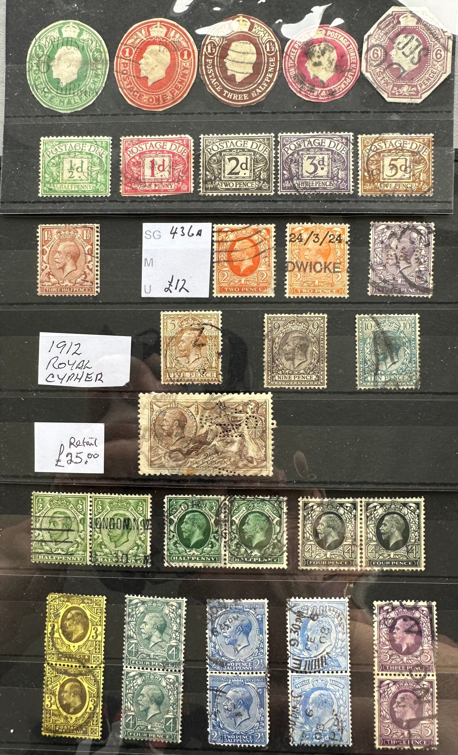 GB KGV selection of used stamps on stock cards inc. Postage Due and embossed, perfin seahorse, pairs and Royal Cypher 1912, London cancel