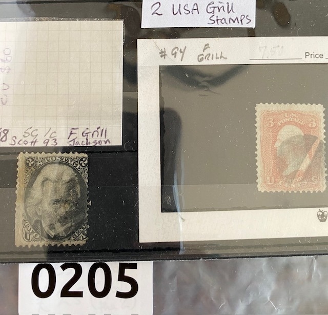 US grill stamps (2) Washington F grill 3 cents orange and c. 1868 Scott # 93 F grill Jackson American stamps