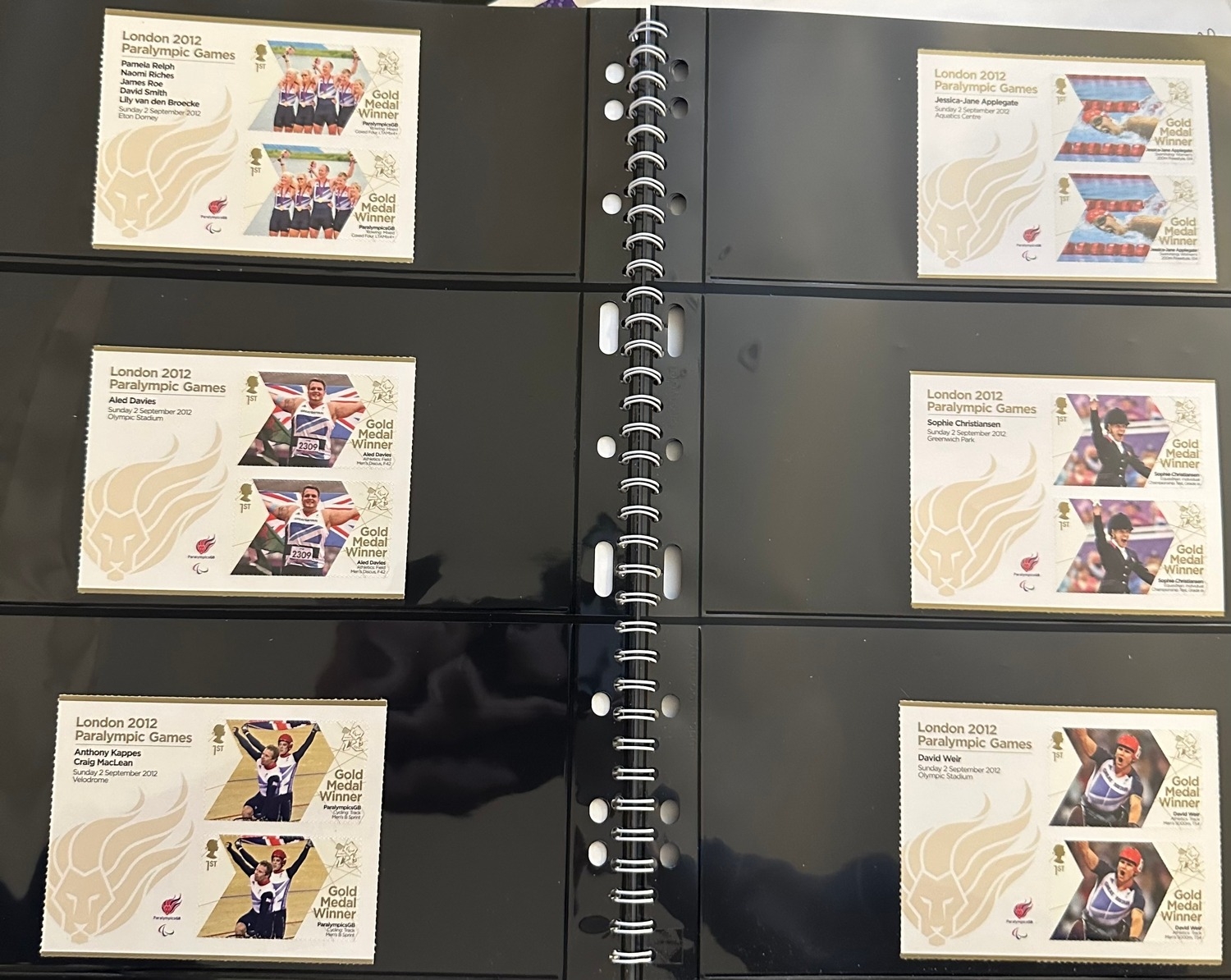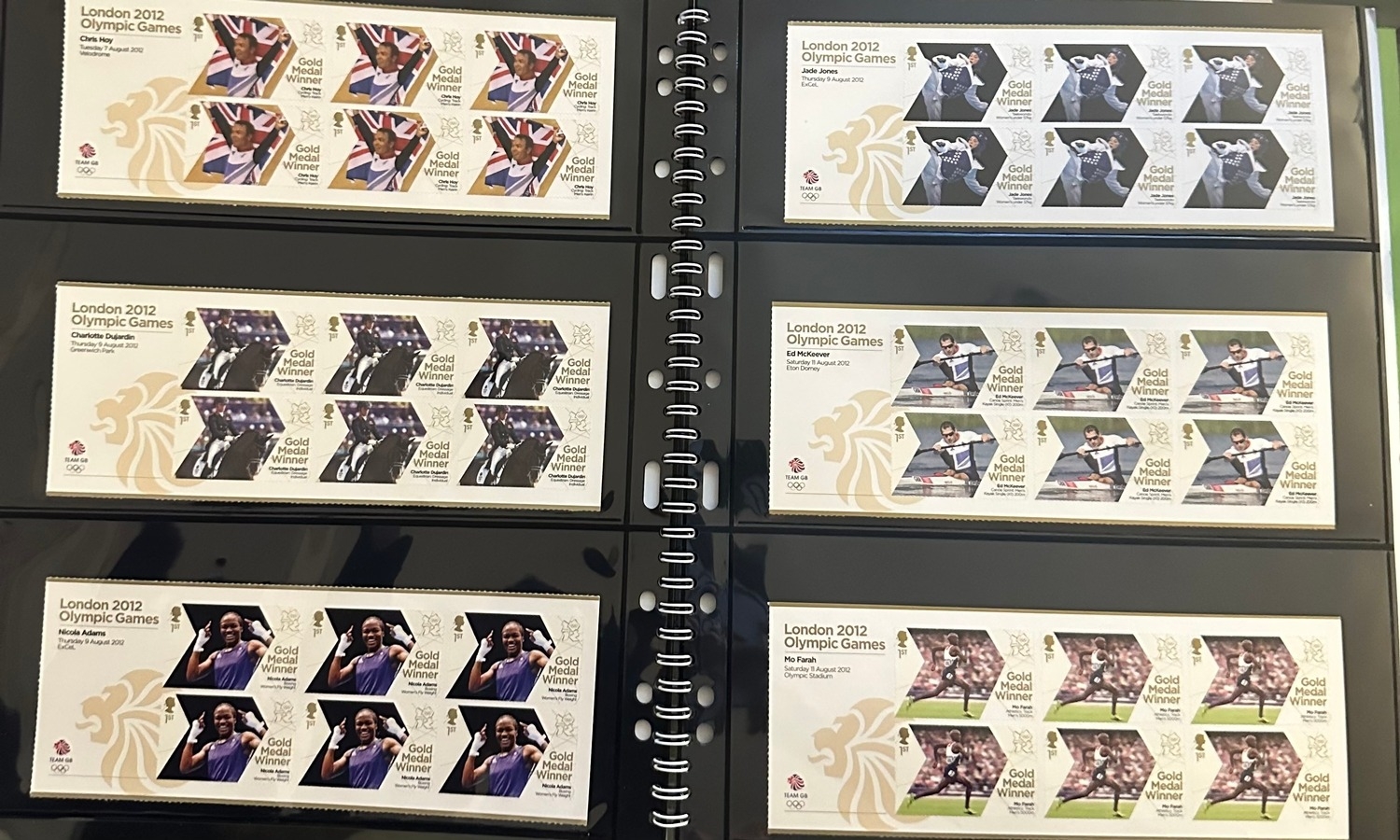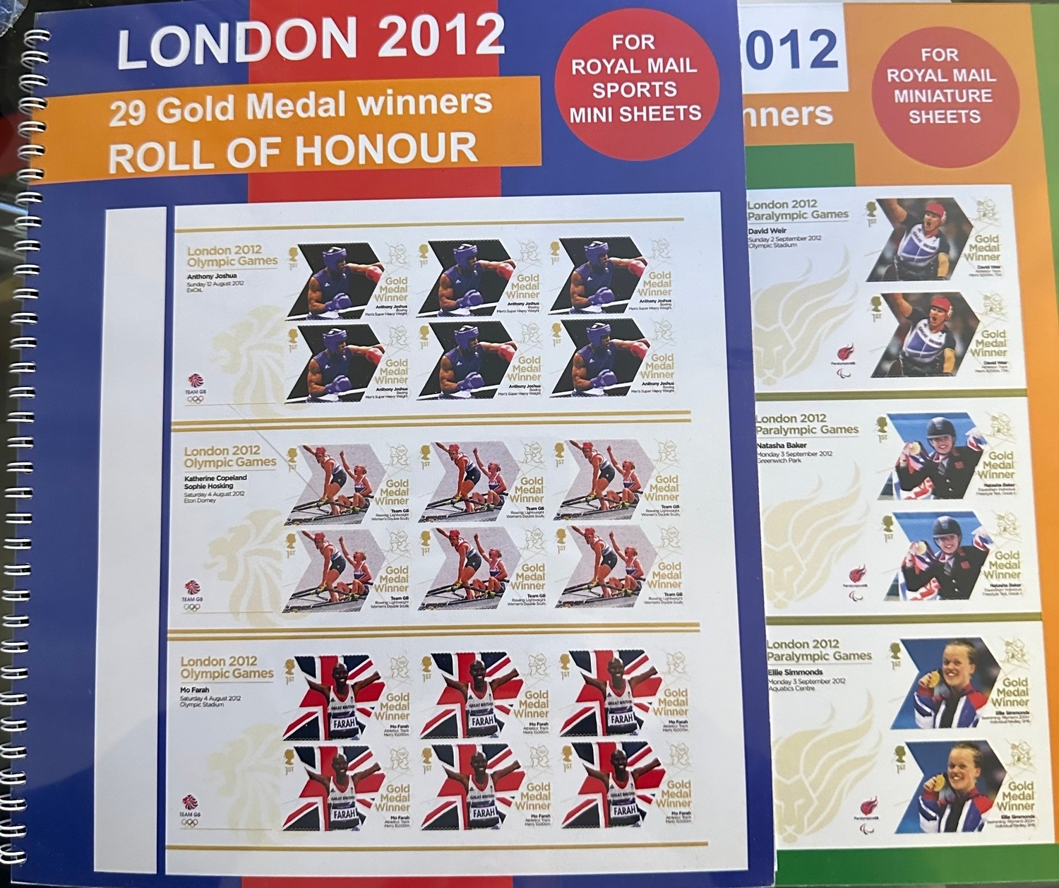 Face value £400+ Royal Mail Olympic & Paralympic Games 2012 complete sets of GB commemorative mint NH stamps Gold Medal Winners being useable self adhesive first class stamps in two folders