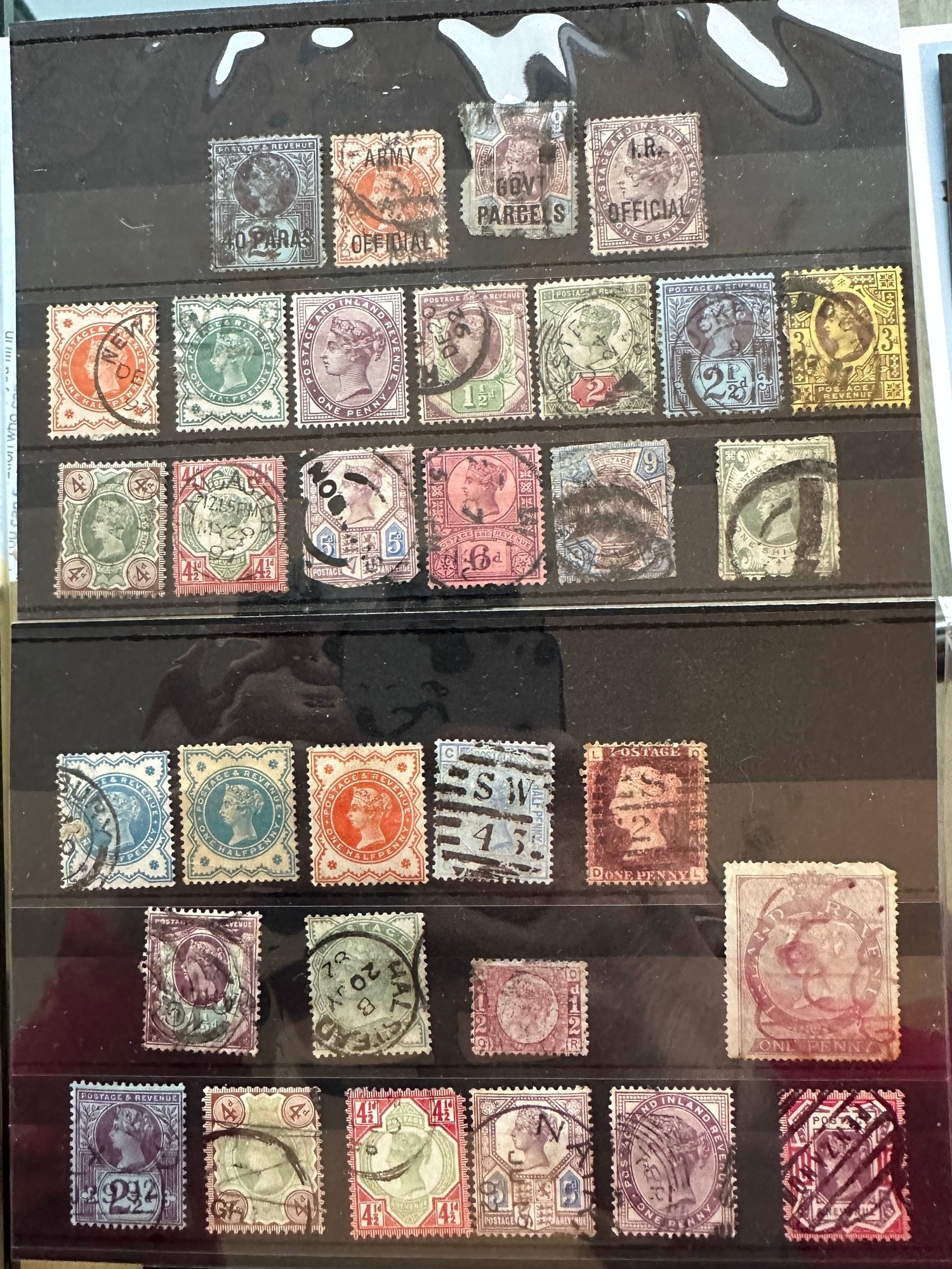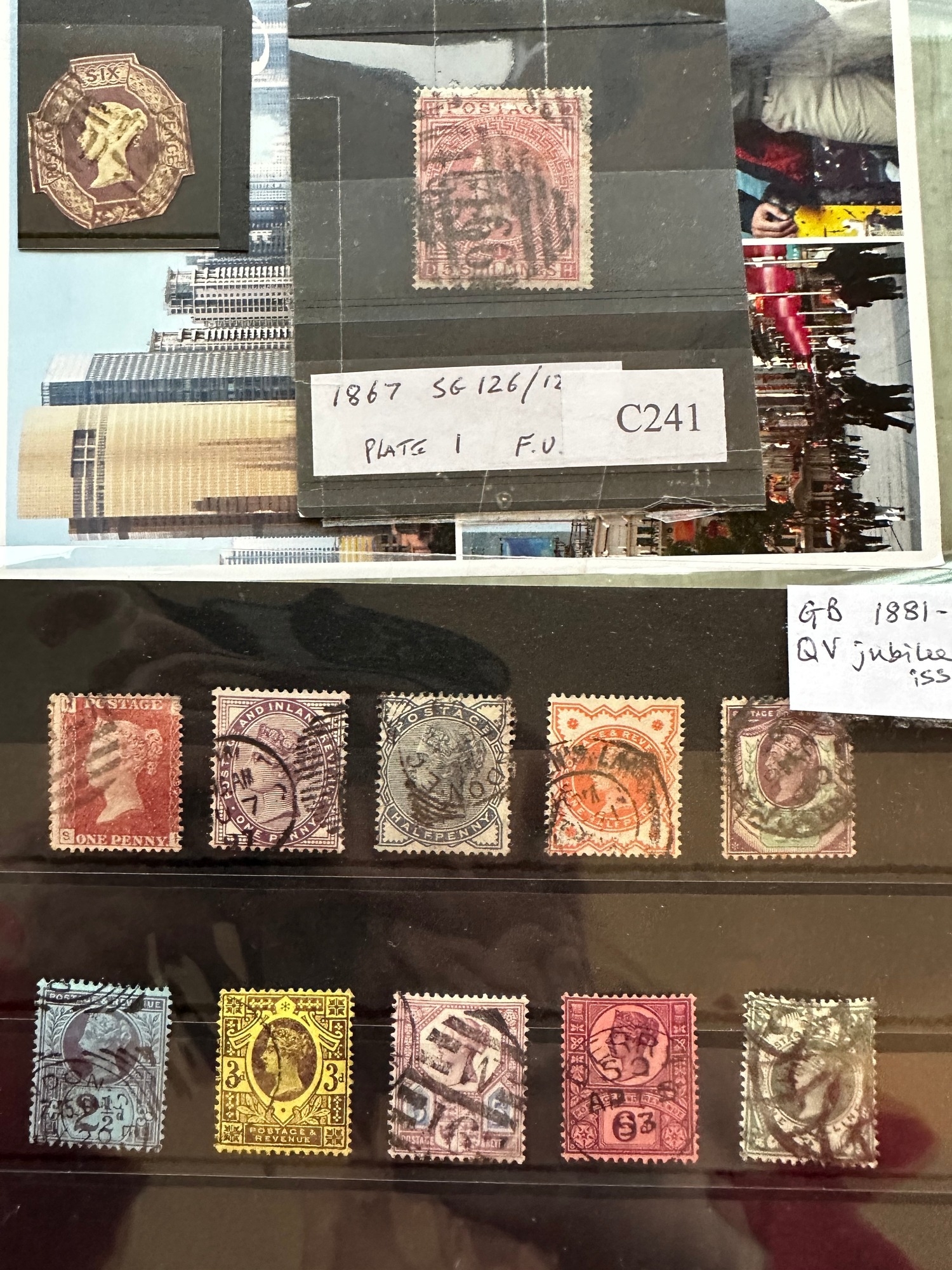 GB QV small collection / selection of early used stamps on stockcards inc Jubilee Edition, penny reds (one plum ?), GOV PARCELS, OFFICIAL overprints, 5 shillings plate 1, line engraved and surface printed. Six pence embossed. London, Penzance, Derry and Halstead cancels noted. One shilling ‘fancy cancel’