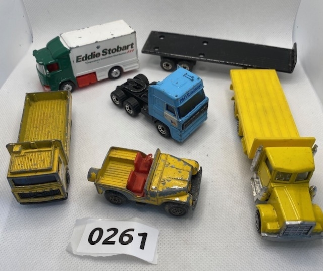 Selection of play worn vehicles including lorries and trailers, Corgi Eddie Stobart truck and Lesney Jeep