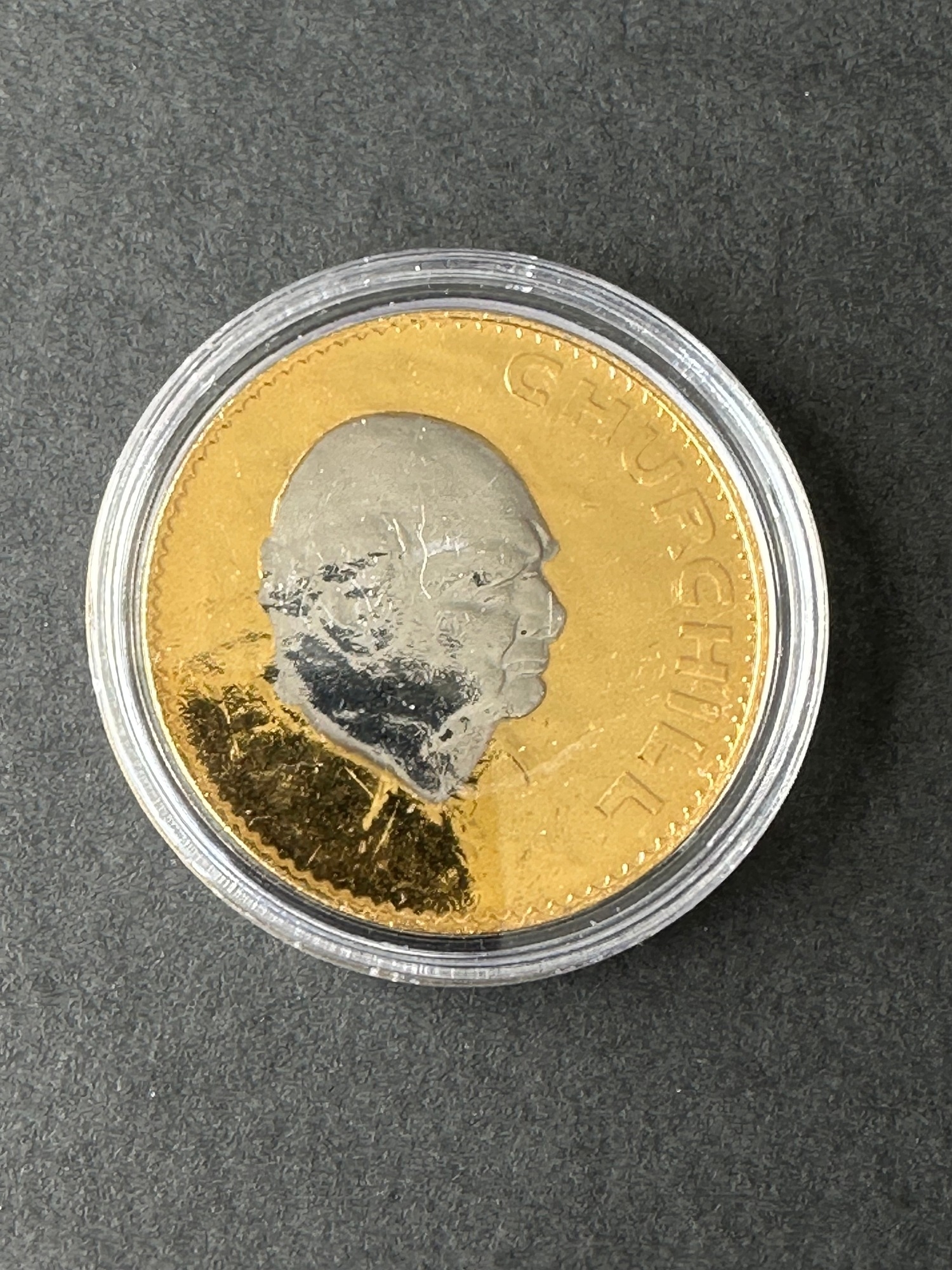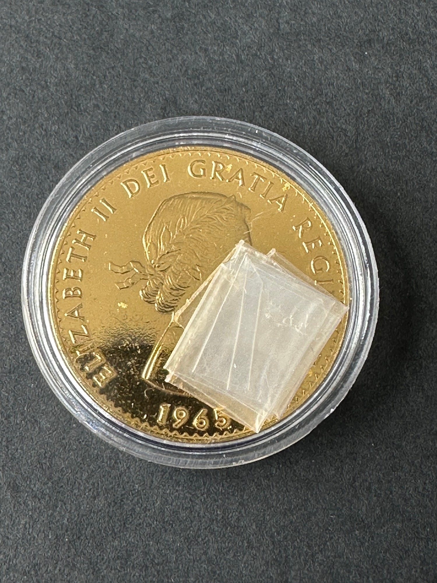 UK GB 1965 Winston Churchill Crown of Five Shillings coin, Fully layered with pure 24 carat gold, Rhodium – platinum accented, 38.6mm, QE2 on the reverse