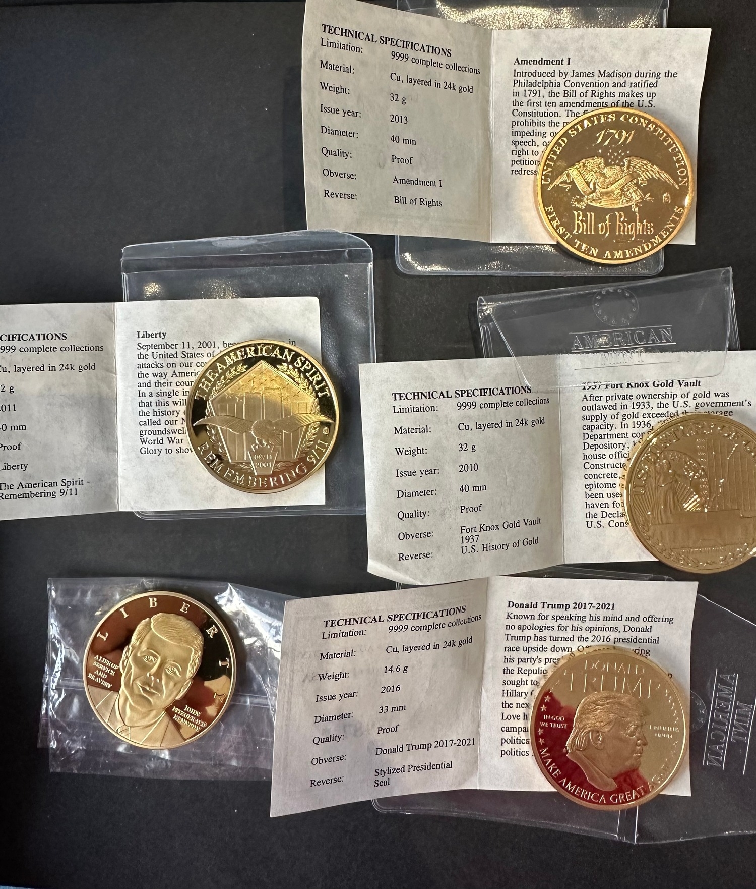 5 copper and 24k gold plated USA proof coins by American mint inc presidents JFK and Trump, majority with COA’s