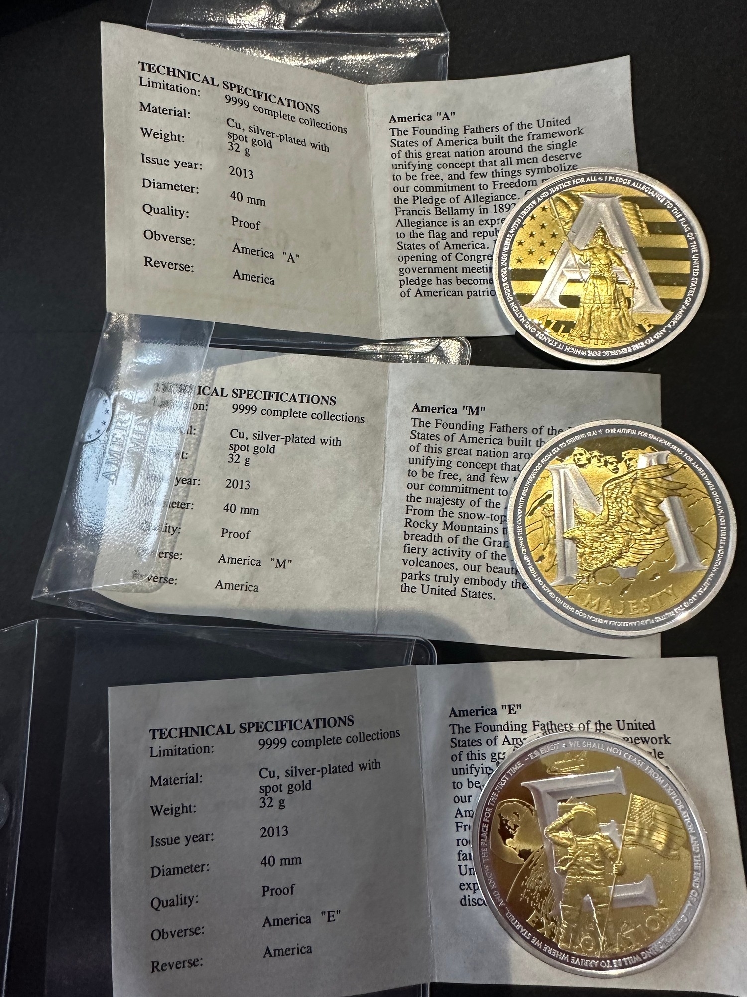 3 silver plated copper proof coins by American Mint with COAs and original plastic pouches