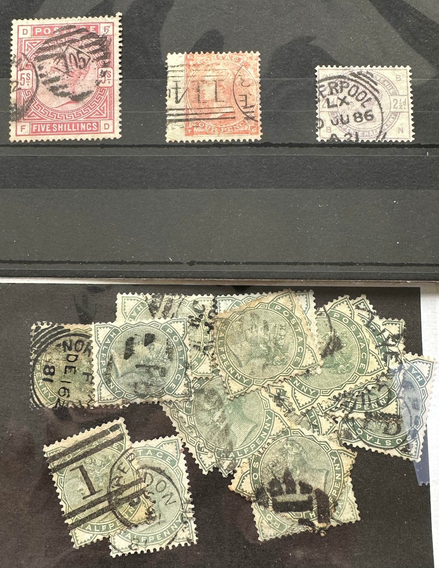 GB QV surface printed stamps selection with London, Liverpool and Northampton cancels noted. 5 shilling stamp