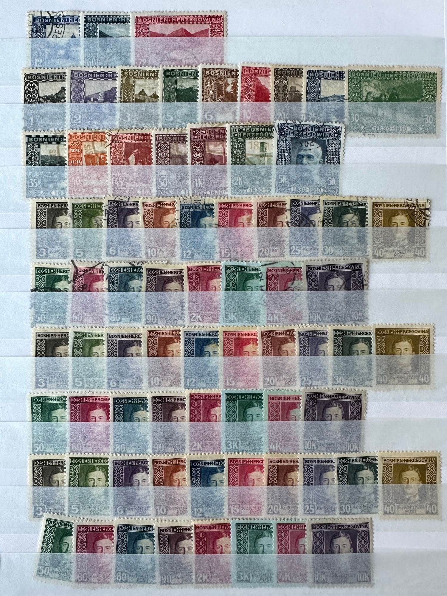 BOSNIA and HERZEGOVINA 1906 -17 stamp selection of mint and used stamps sets on stockleaf inc. 1910 Birthday Set ( 16) f.u. (cat. �60), 1917 Emperor Charles Set m.m. ( 2 sets of 18, �29/set ) and f.u. ( �32). S.t.c. �180n a few years ago. (73 stamps)