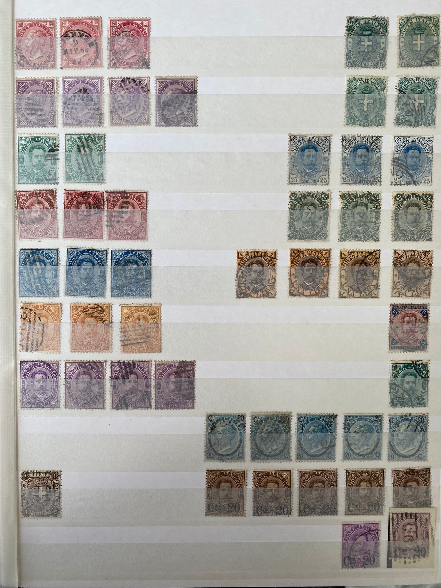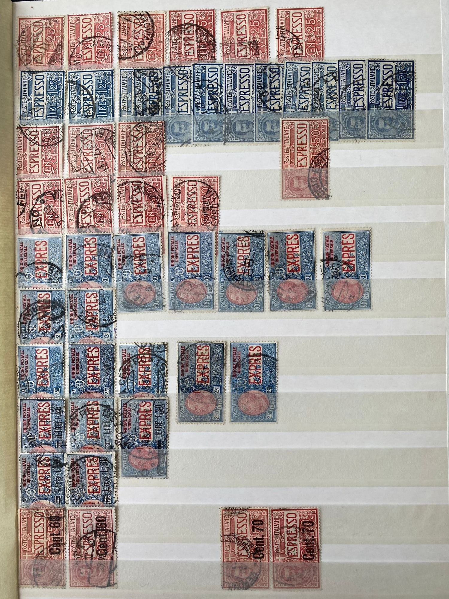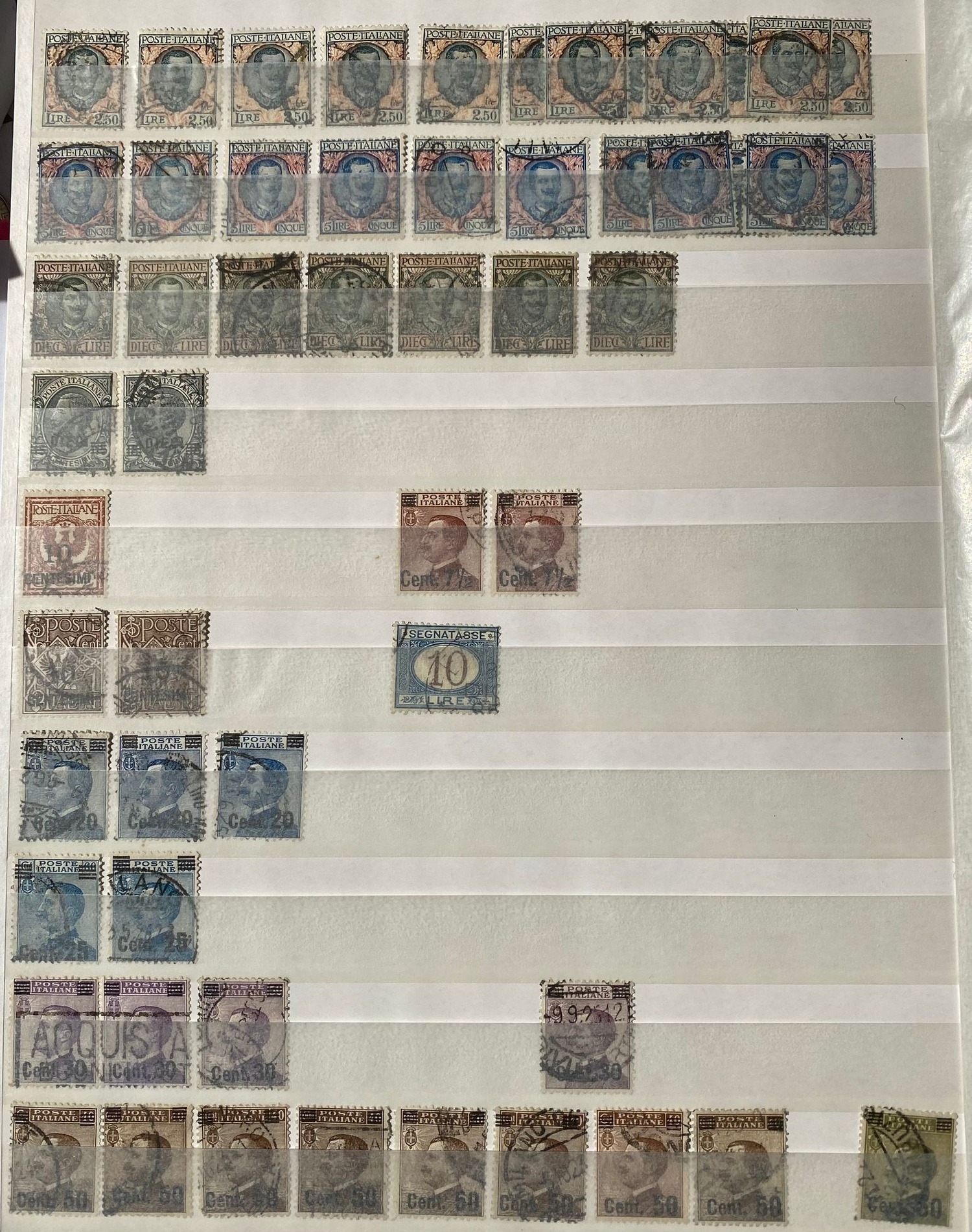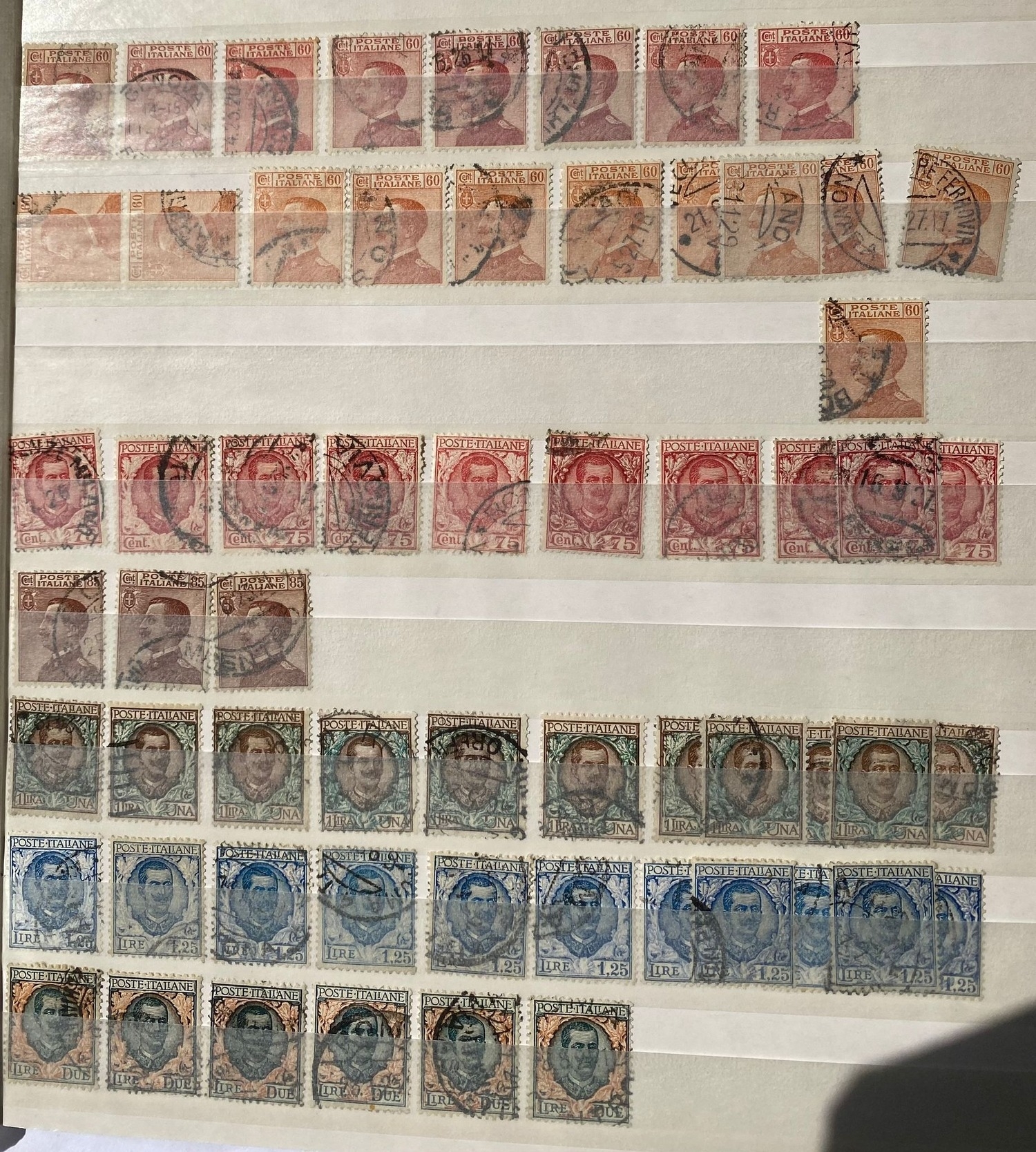 ITALY duplicated lot of early stamps on stockleaves of 1863-65 issue (c.48, inc 2 lire), 1889 values inc. 1lire stamp (4), 1891-97 5lire, 1901-08 defins (c.353, inc.7 of 1910 10 lire0, 1927-29 2l55 (2) and 2l65, 1903-26 Express issues (49), and many others