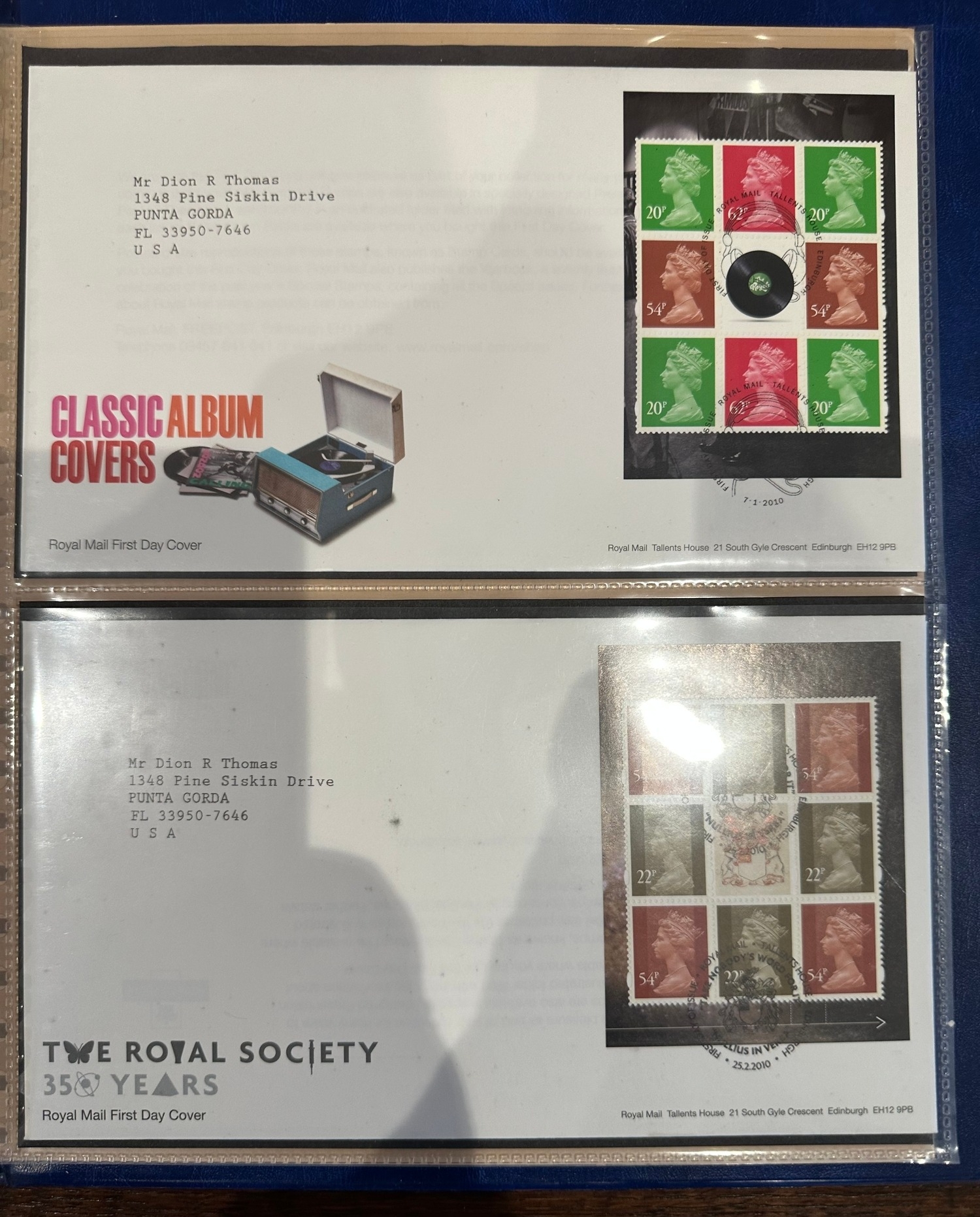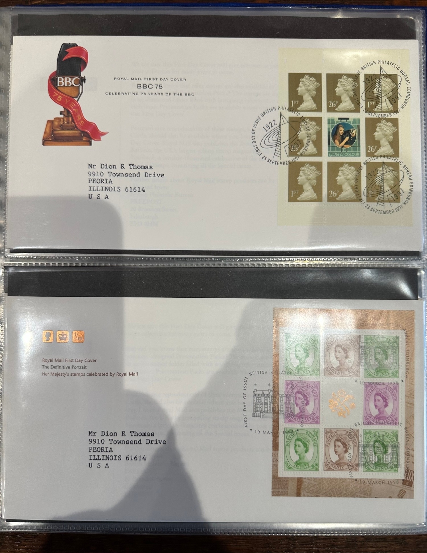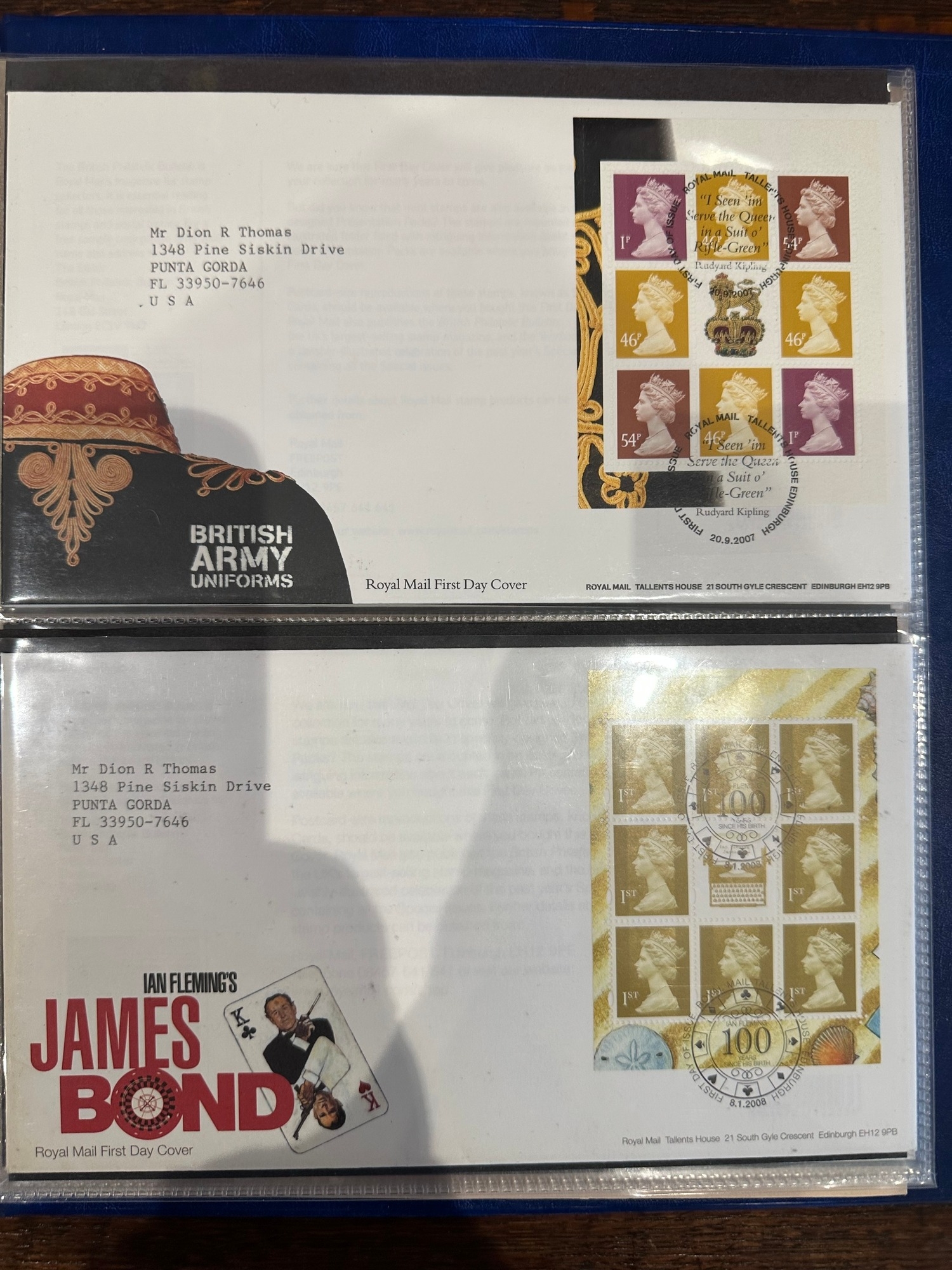 Album containing over 50 GB prestige stamp booklet panes on FDC’s ( to 2010 ) all sent to US typed addresses which is more unusual inc. James Bond, Classic Album Covers