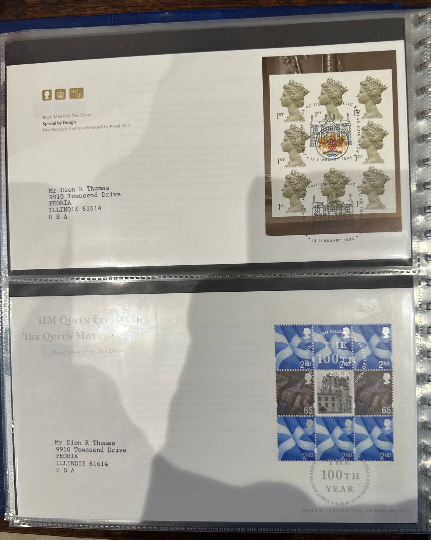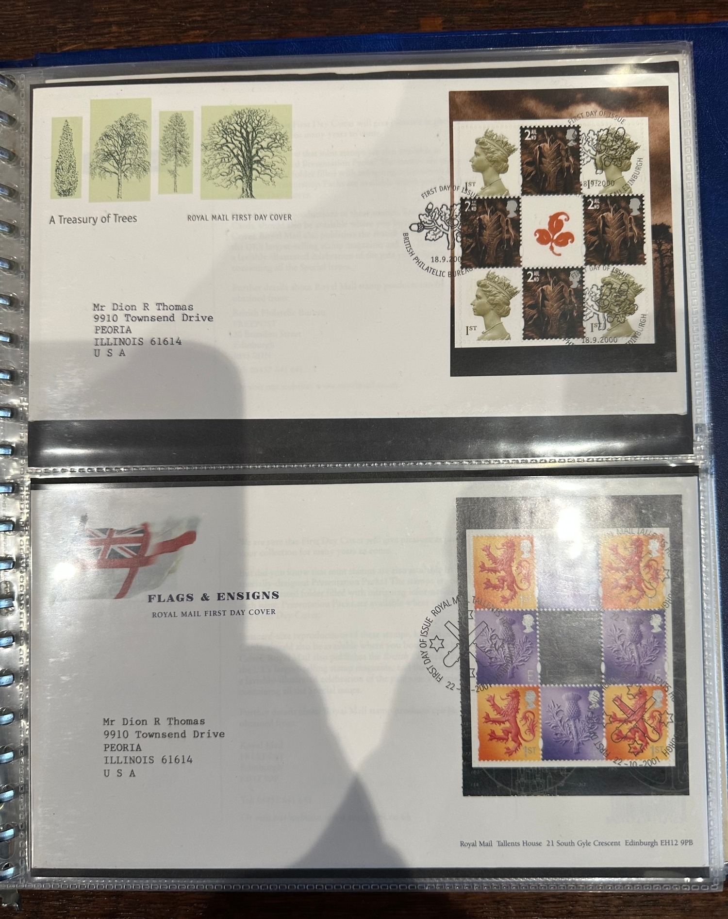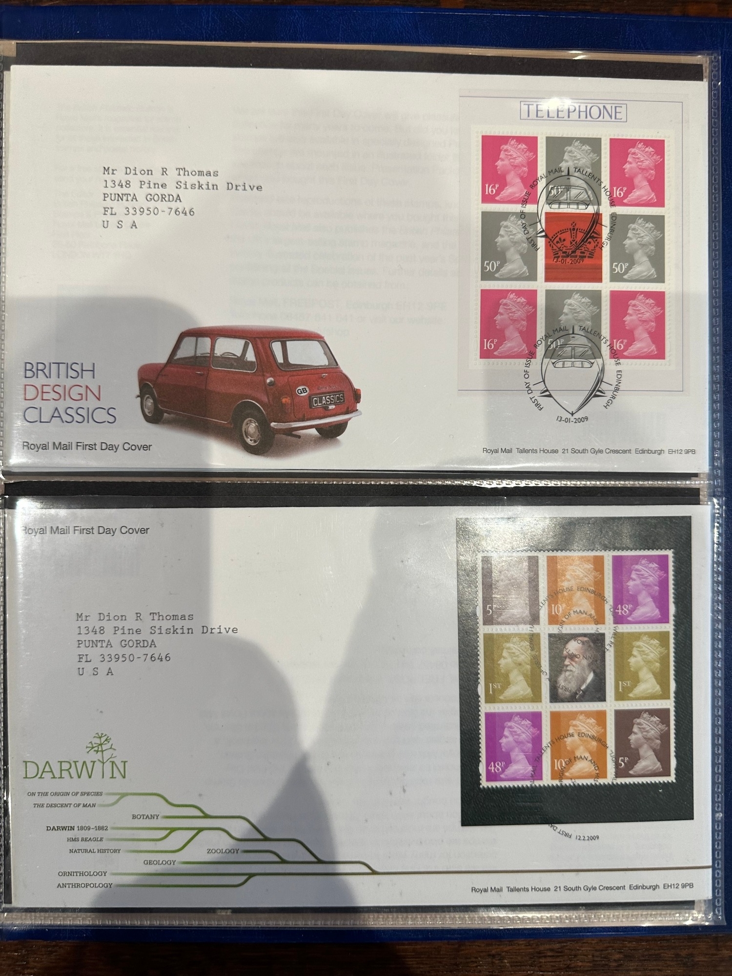 Album containing over 50 GB prestige stamp booklet panes on FDC’s ( to 2010 ) all sent to US typed addresses which is more unusual inc. James Bond, Classic Album Covers