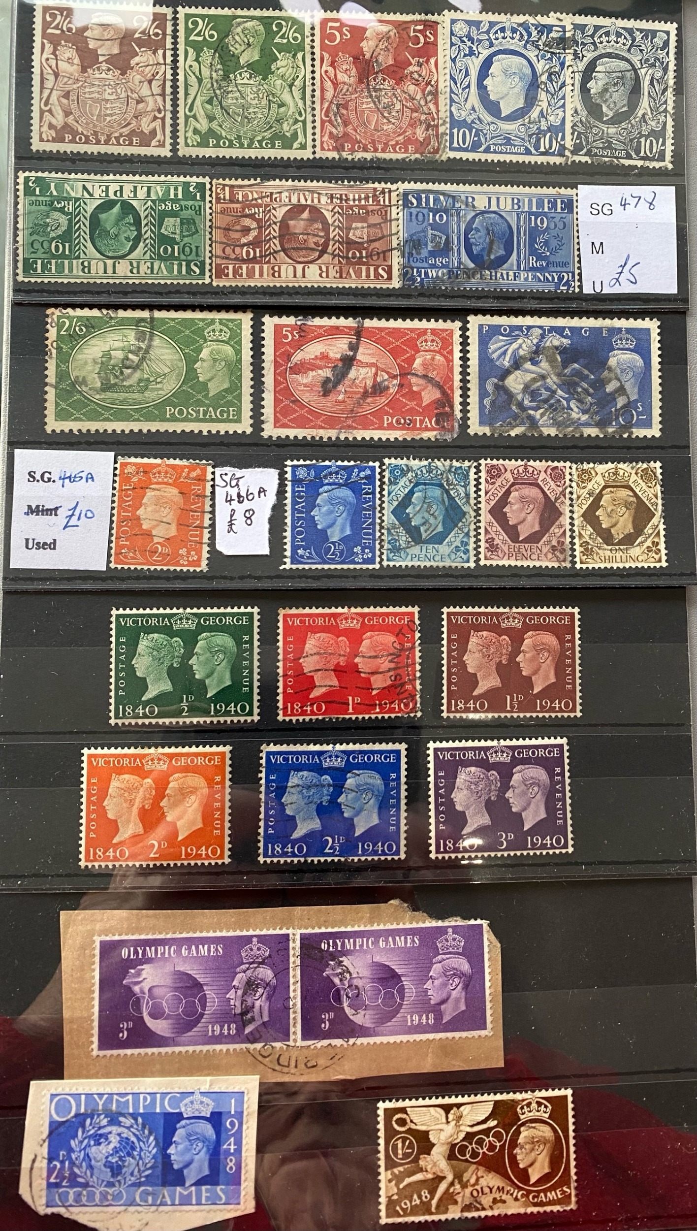 GB KGVI mainly used stamp sets on stock cards inc inverted w/m (? unchecked) Olympics 1948. London and Kensington cancels noted