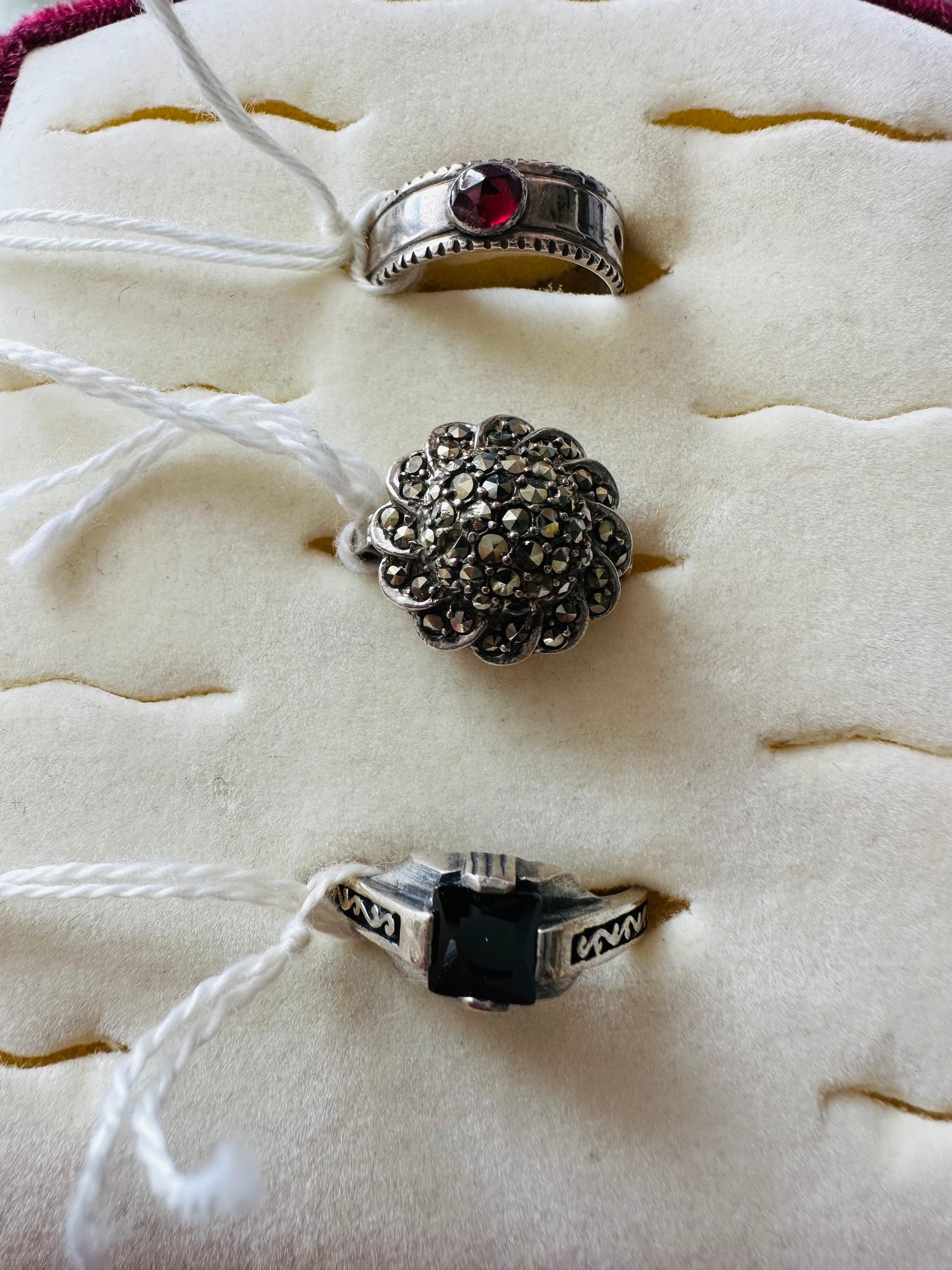 Silver rings (3) including Marcasite size R, top one size N and haematite size U