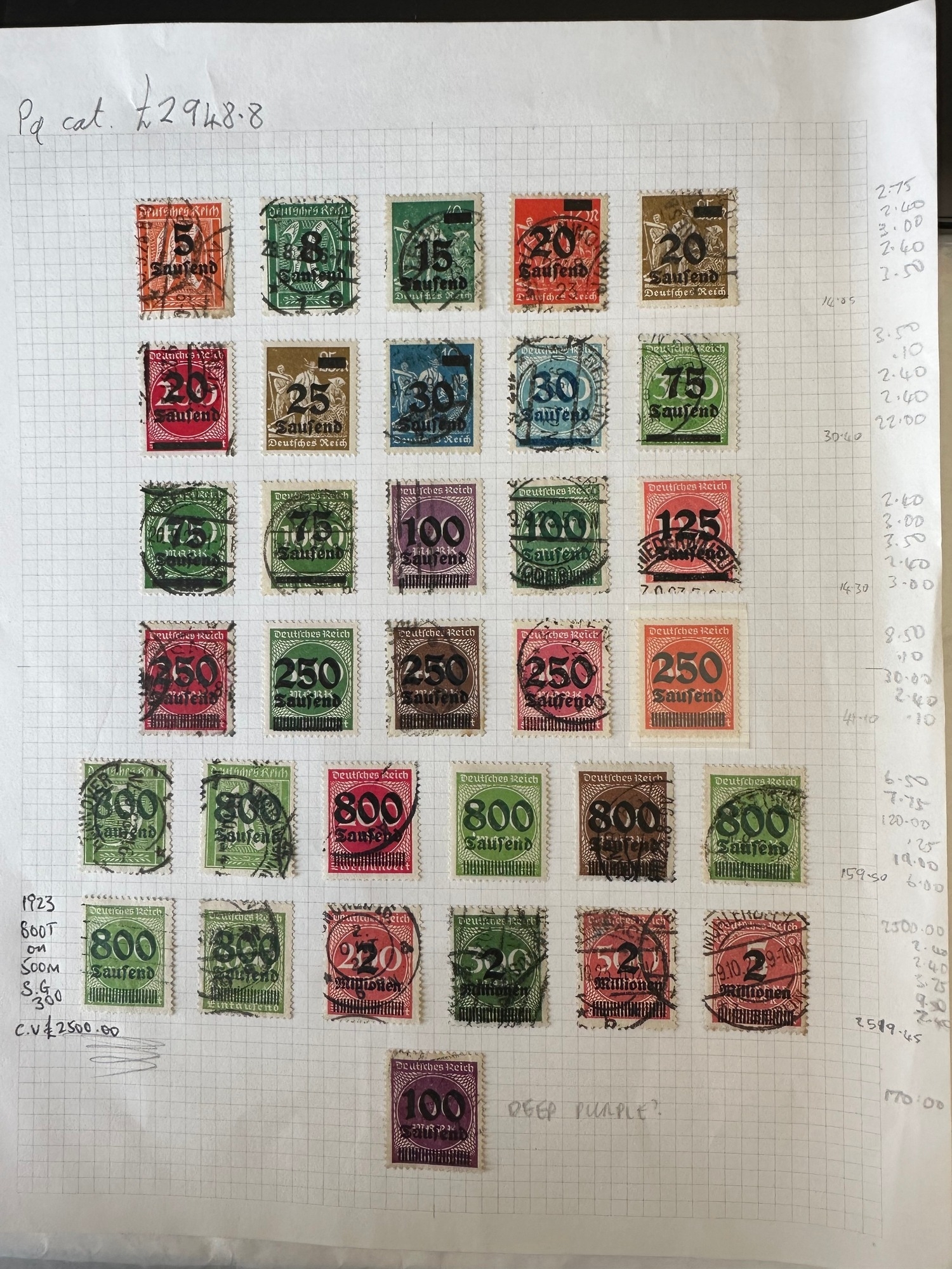 GERMANY Inflation overprints mainly used complete set of the perforated stamps. Includes 800T on 200m and 800T on 500m (high cat. £2,500) SG 274-305. High cat value £2,948
