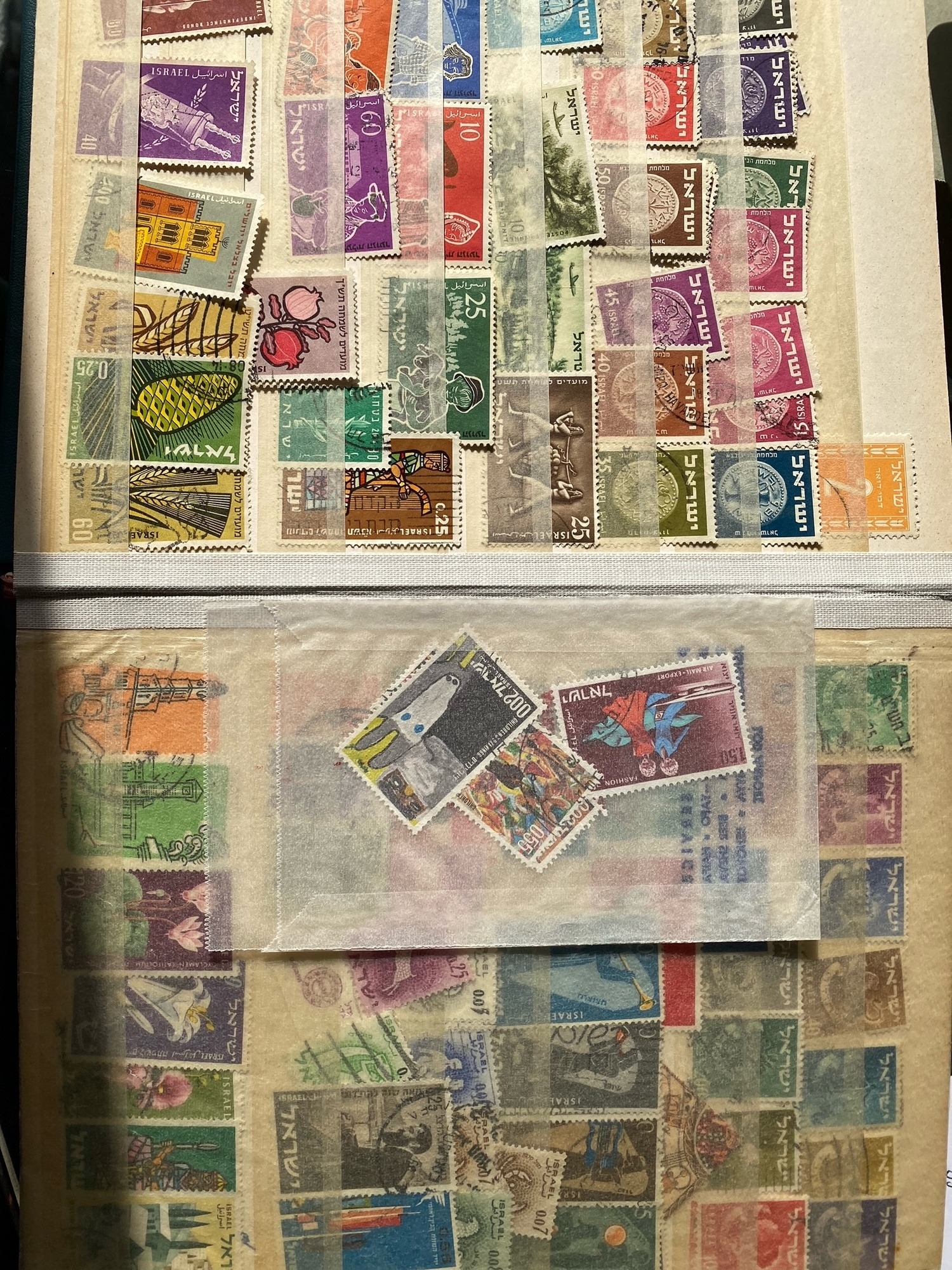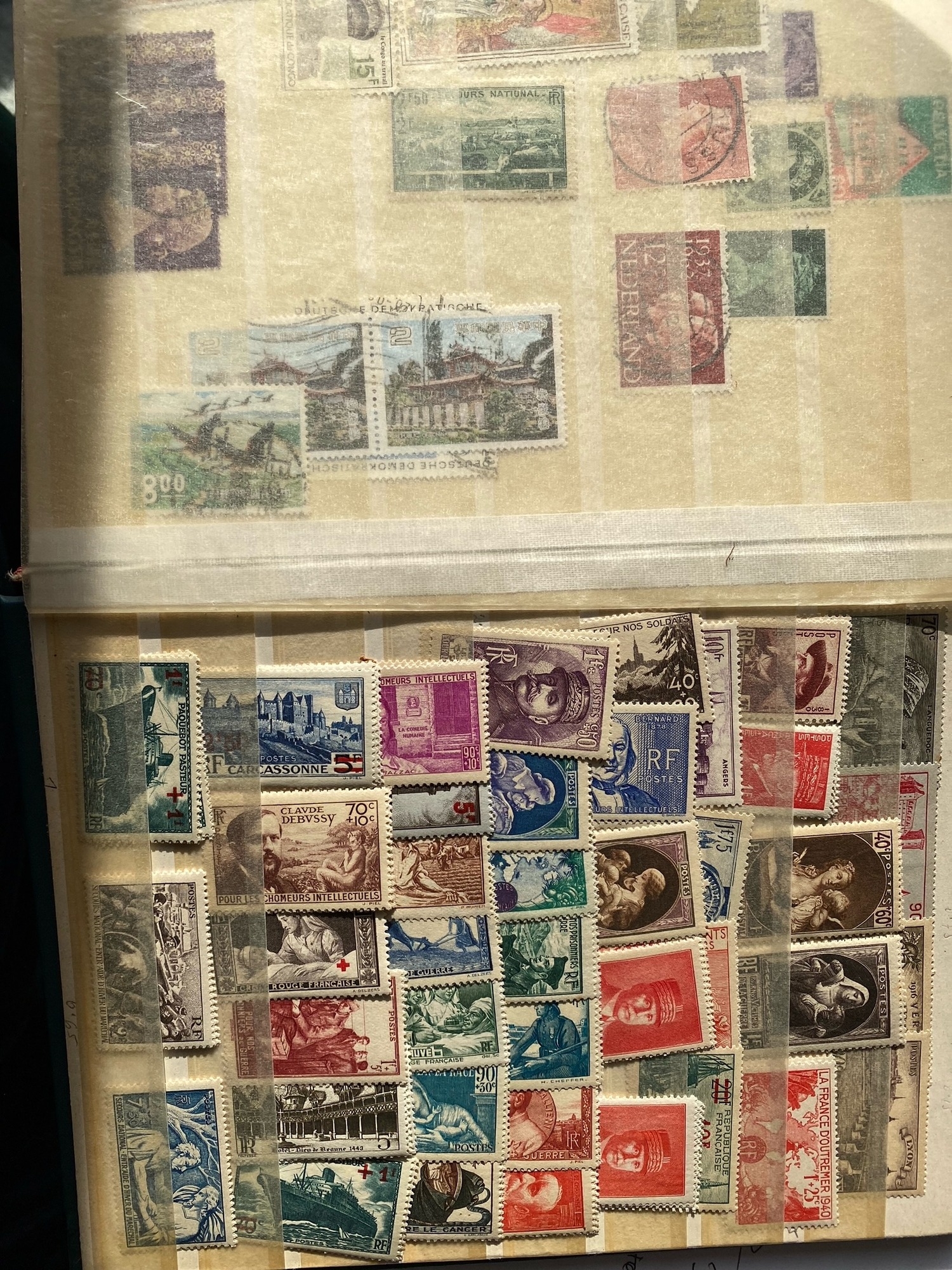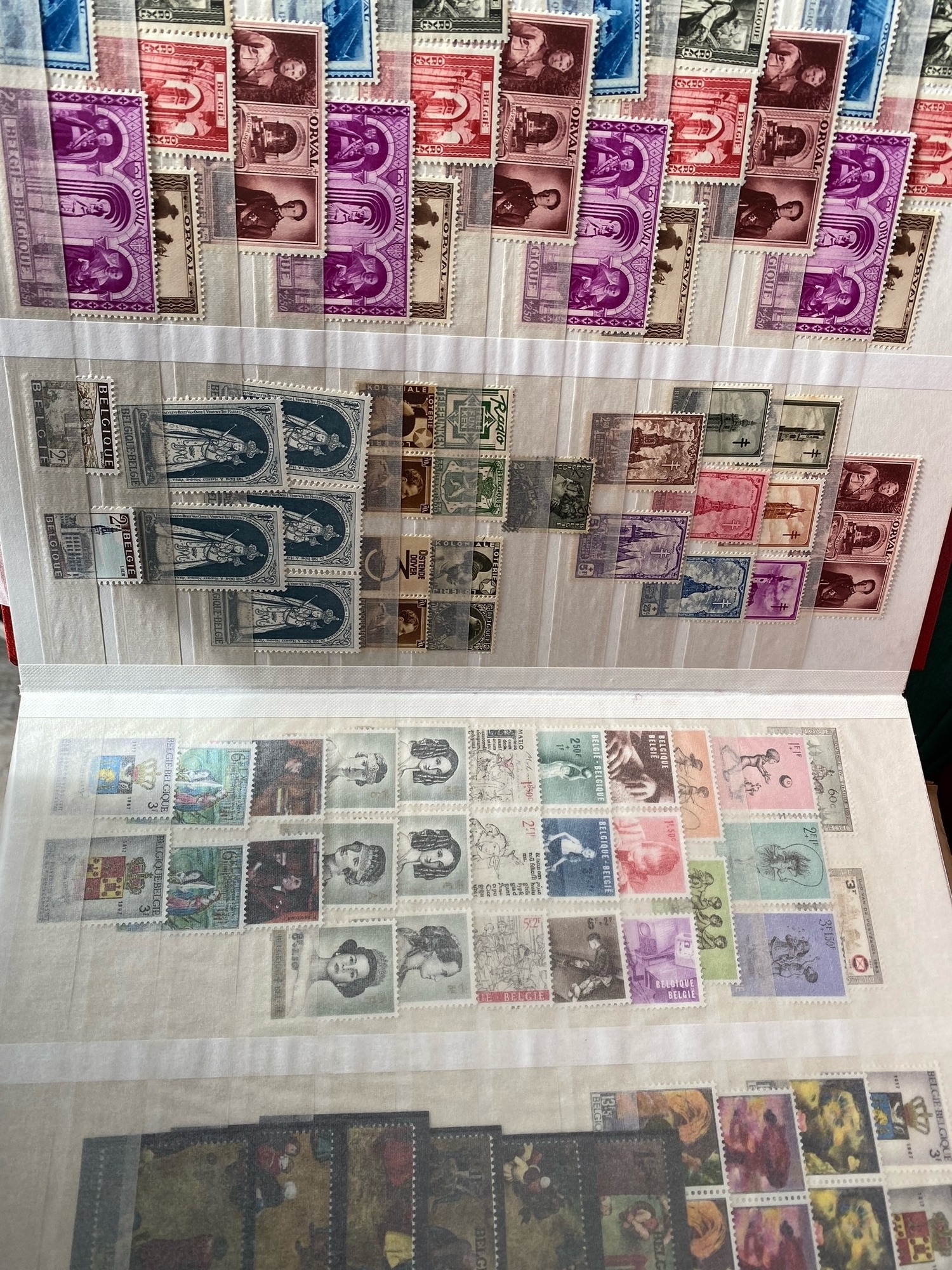 Three albums of world wide stamps including mint and used examples, a fairly well stocked old black album ( spring back sheets have come loose ), a smaller number of stamps in a more recent red stock book and good number of stamps in little green album / stock book. Estimated a good couple hundred stamps or more
