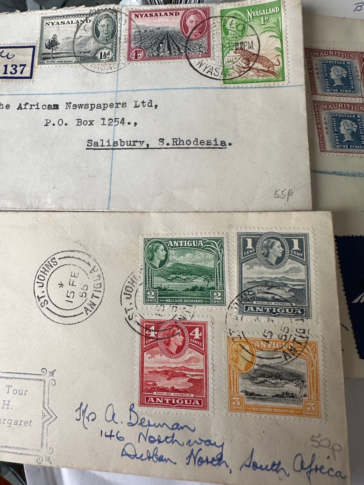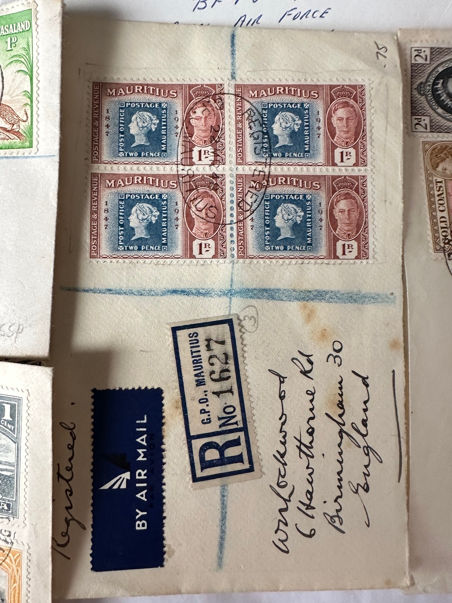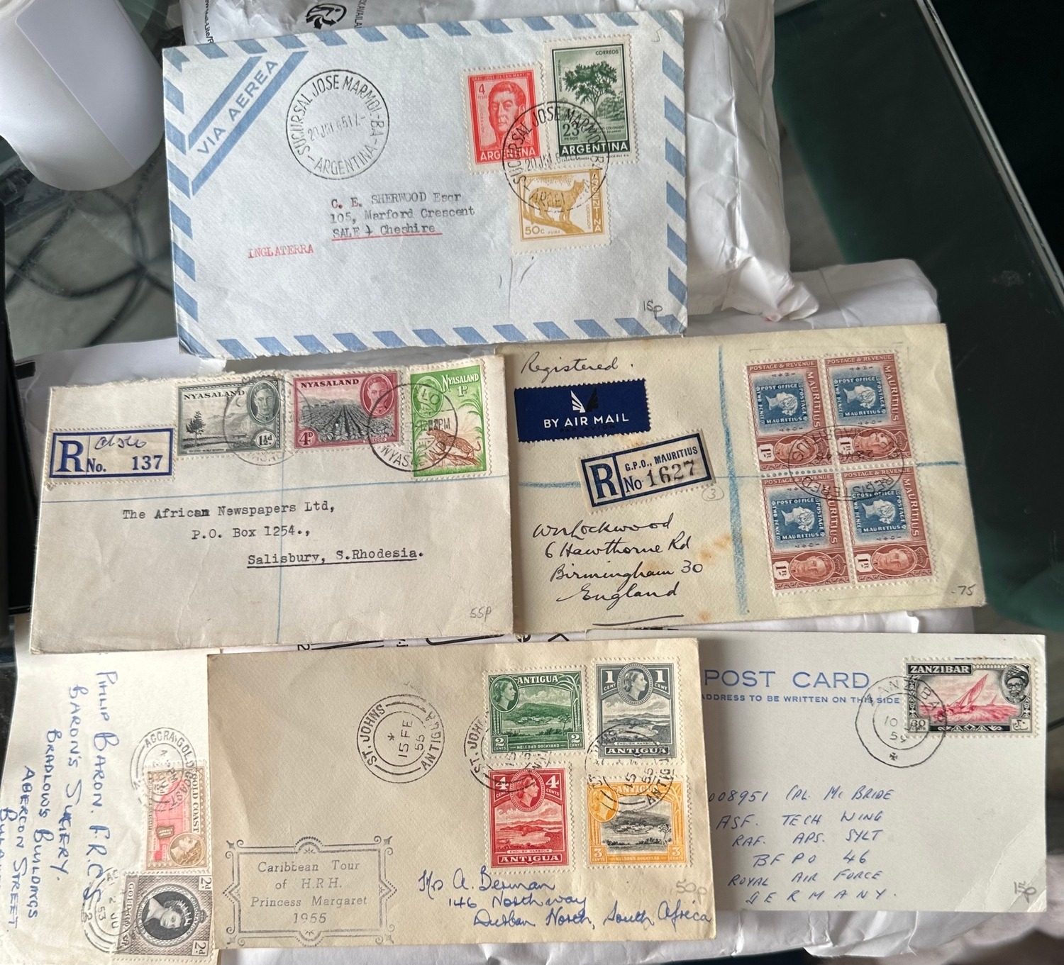 Stamps on commonwealth, Argentina and Zanzibar (postcard) registered and Airmail covers inc Mauritius 1948 1R block of 4 stamps